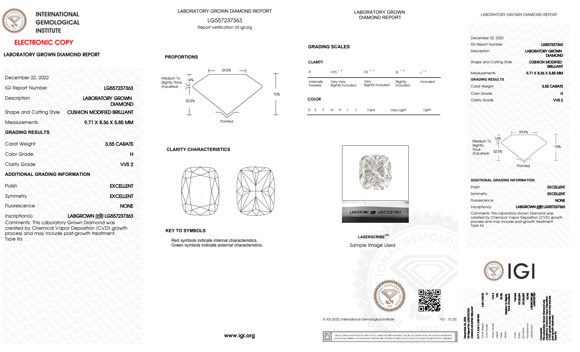 Your 3.55 carat Cushion lab diamond is graded H color (Near Colorless), and you can read more about H color diamonds here.