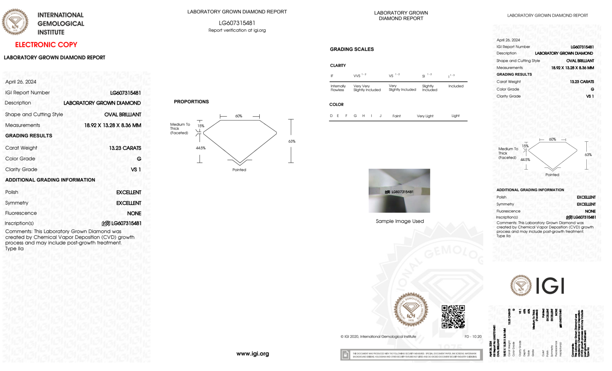 Your 13.23 carat Oval lab diamond is graded G color (Near Colorless), and you can read more about G color diamonds here.
