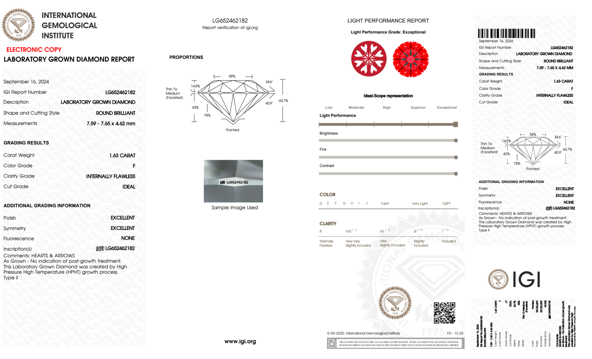 Your 1.63 carat Round lab diamond is graded IF clarity, which stands for Internally Flawless. Read more about IF clarity diamonds here, or learn more about diamond clarity in general here.