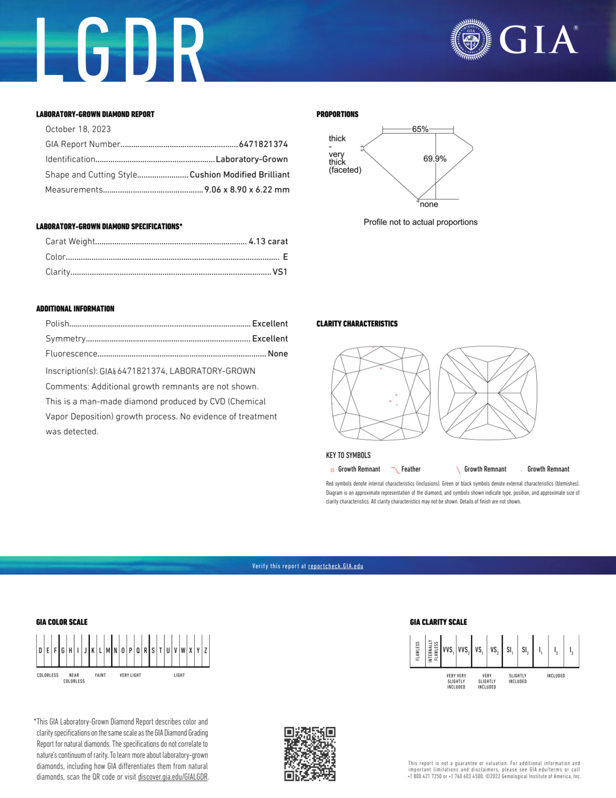 Your 4.13 carat Cushion lab diamond is graded E color (Colorless), and you can read more about E color diamonds here.