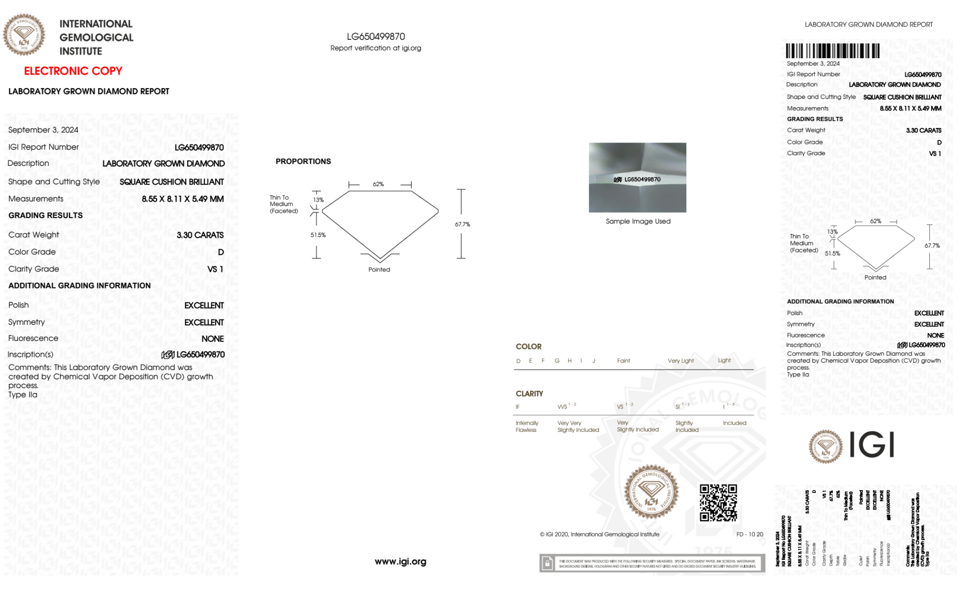 Your 3.30 carat Cushion lab diamond is graded D color (Colorless), and you can read more about D color diamonds here.