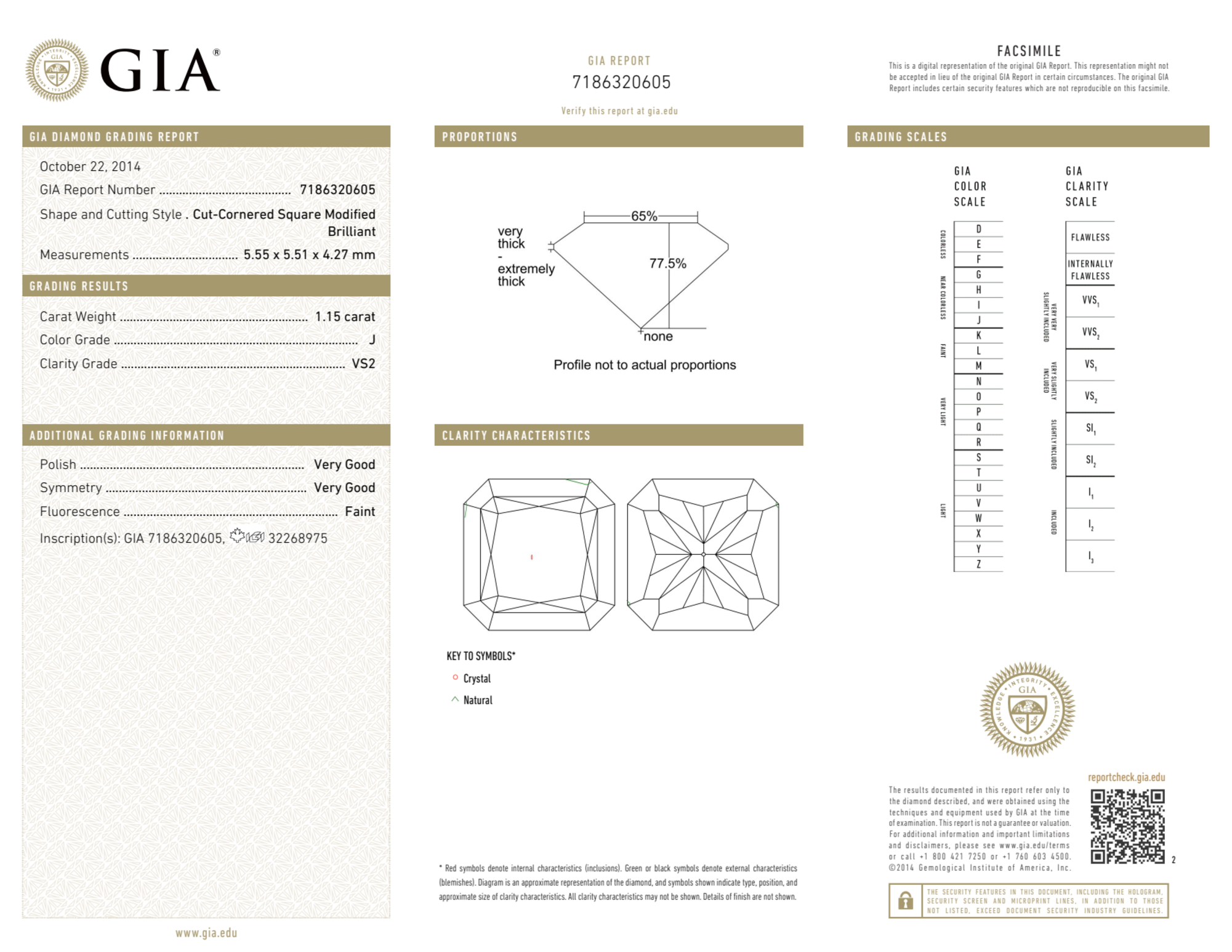 Your 1.15 carat Radiant natural diamond is graded VS2 clarity, which stands for Very Slightly Included 2. Read more about VS2 clarity diamonds here, or learn more about diamond clarity in general here.