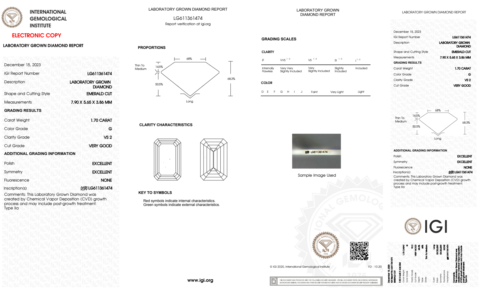 Your 1.70 carat Emerald lab diamond is graded G color (Near Colorless), and you can read more about G color diamonds here.