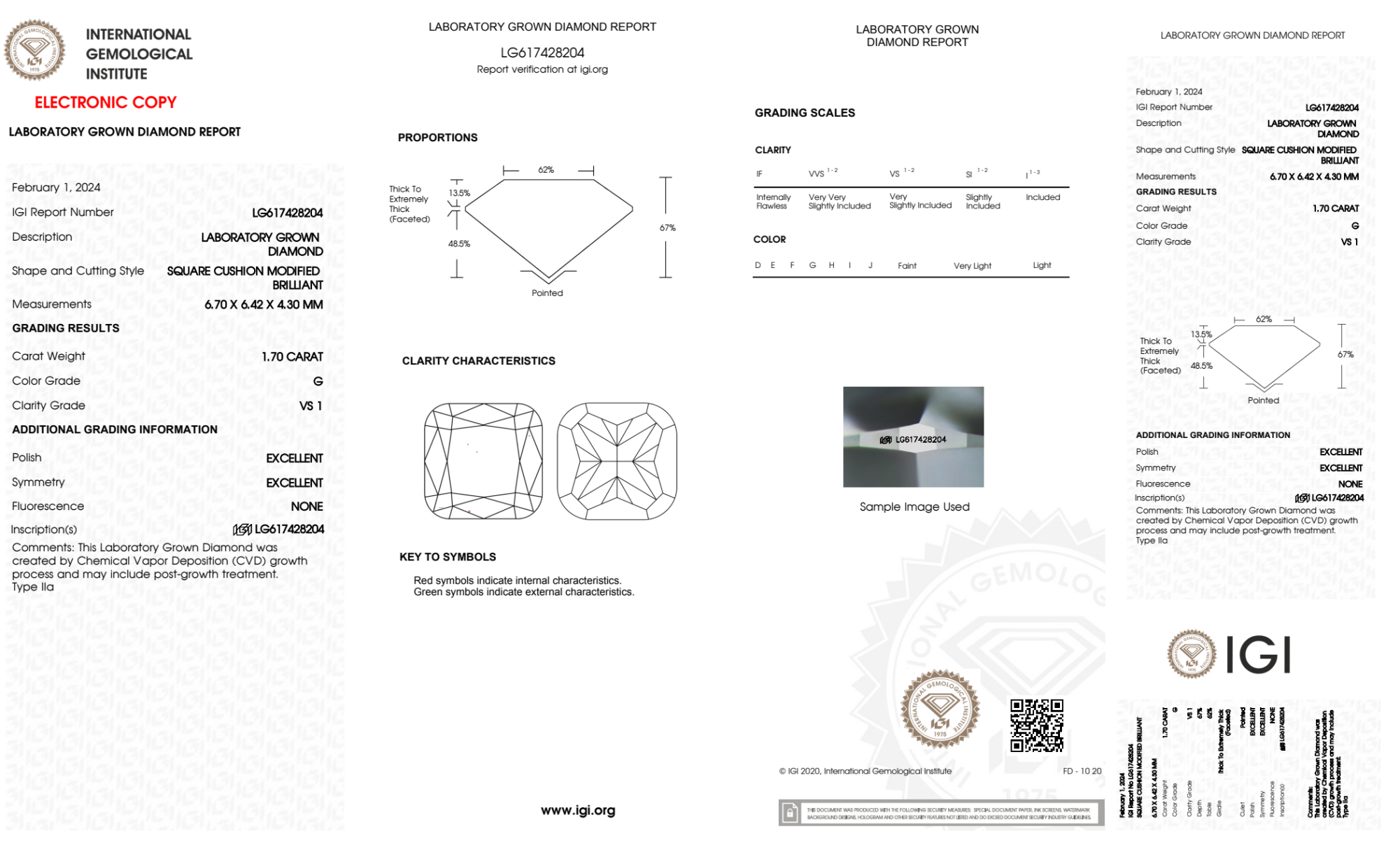 Your 1.70 carat Cushion lab diamond is graded G color (Near Colorless), and you can read more about G color diamonds here.