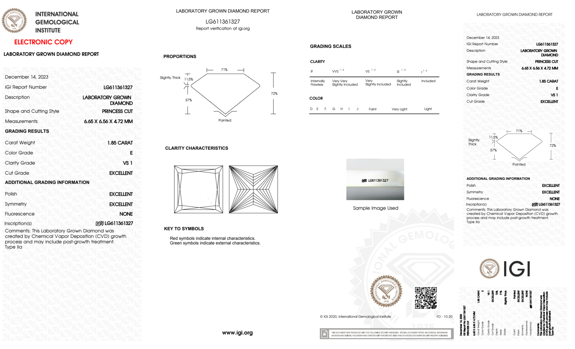 Your 1.85 carat Princess lab diamond is graded E color (Colorless), and you can read more about E color diamonds here.