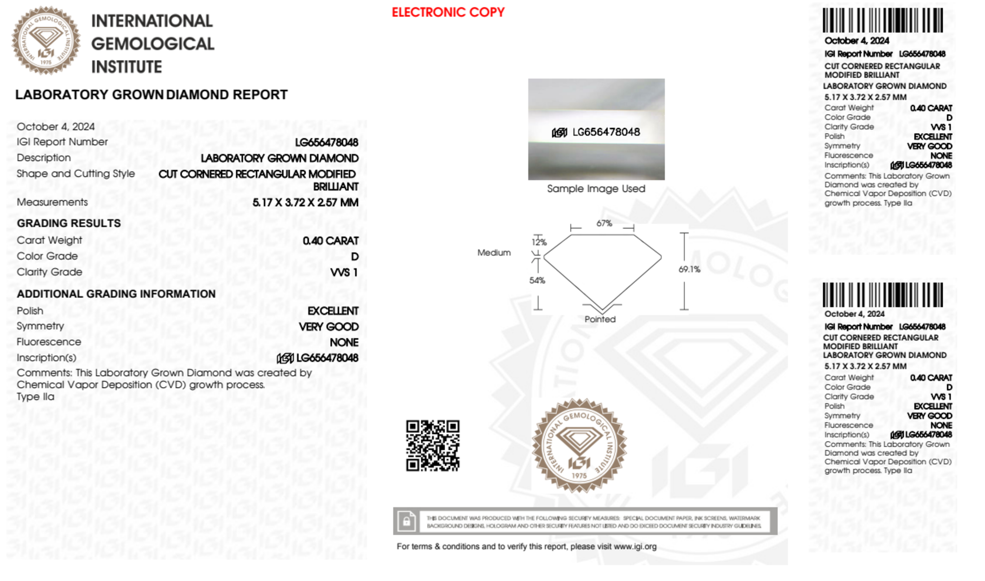 Your 0.40 carat Radiant lab diamond is graded VVS1 clarity, which stands for Very Very Slightly Included 1. Read more about VVS1 clarity diamonds here, or learn more about diamond clarity in general here.