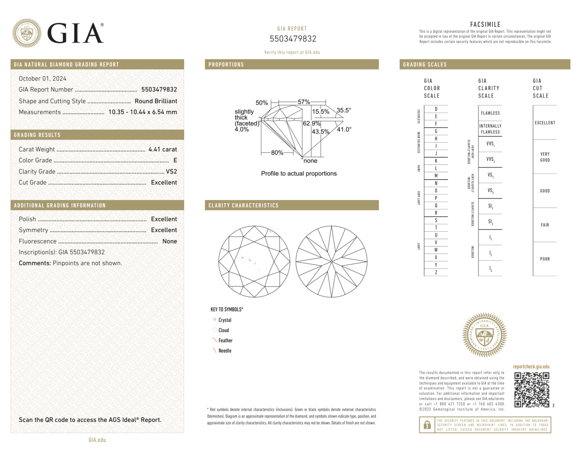 Your 4.41 carat Round natural diamond is graded E color (Colorless), and you can read more about E color diamonds here.