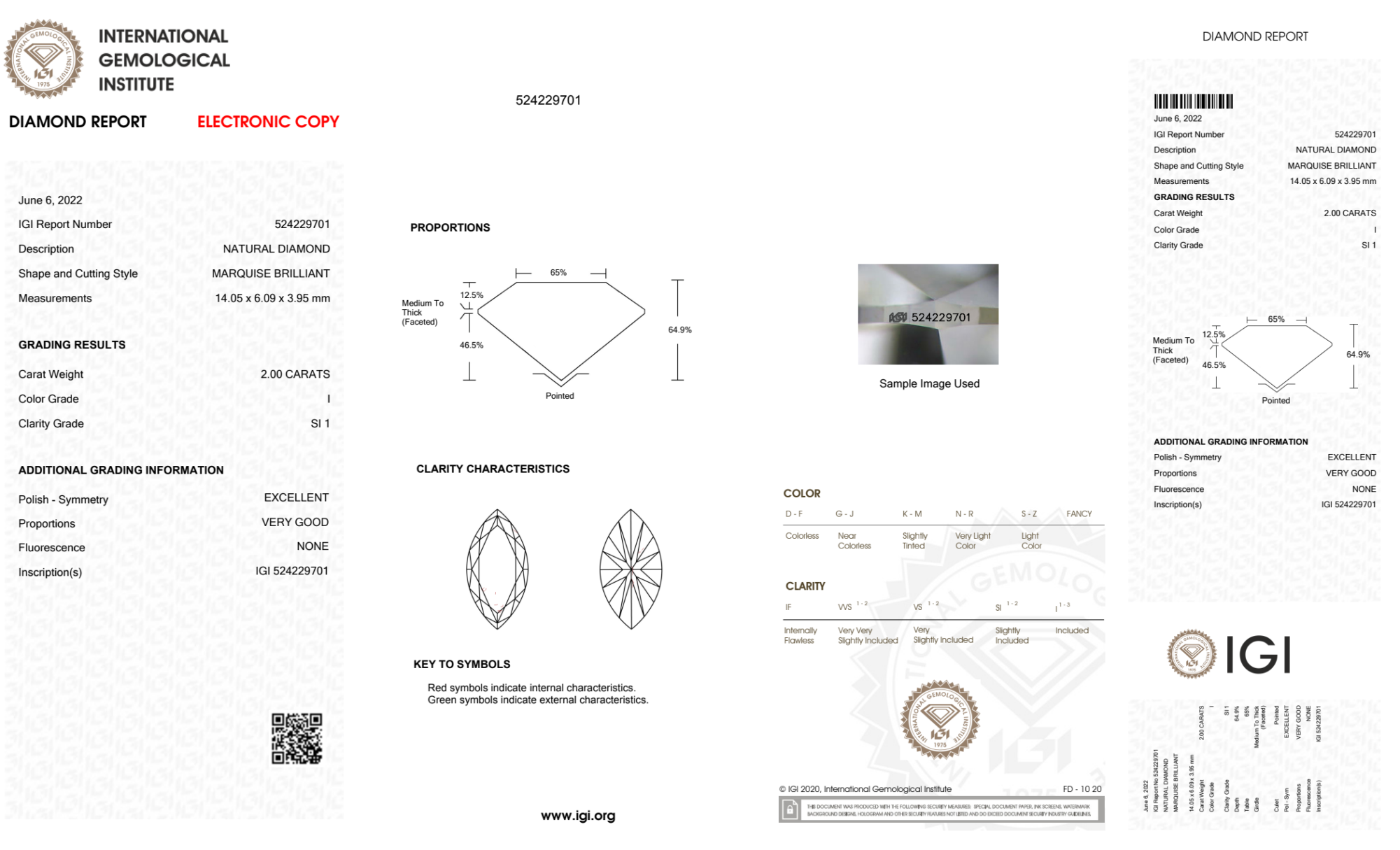 Your 2.00 carat Marquise natural diamond is graded I color (Near Colorless), and you can read more about I color diamonds here.
