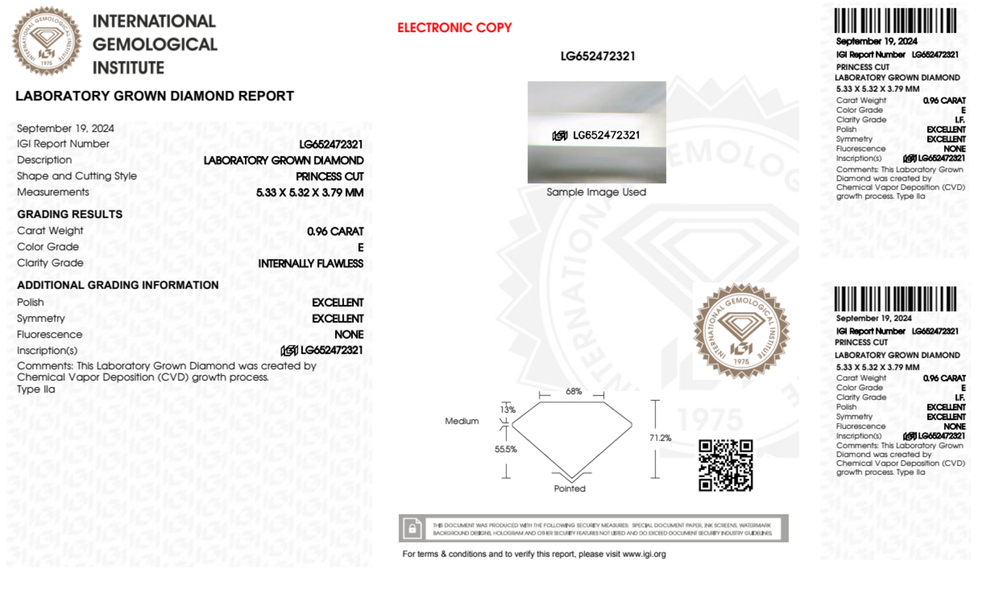 Your 0.96 carat Princess lab diamond is graded IF clarity, which stands for Internally Flawless. Read more about IF clarity diamonds here, or learn more about diamond clarity in general here.