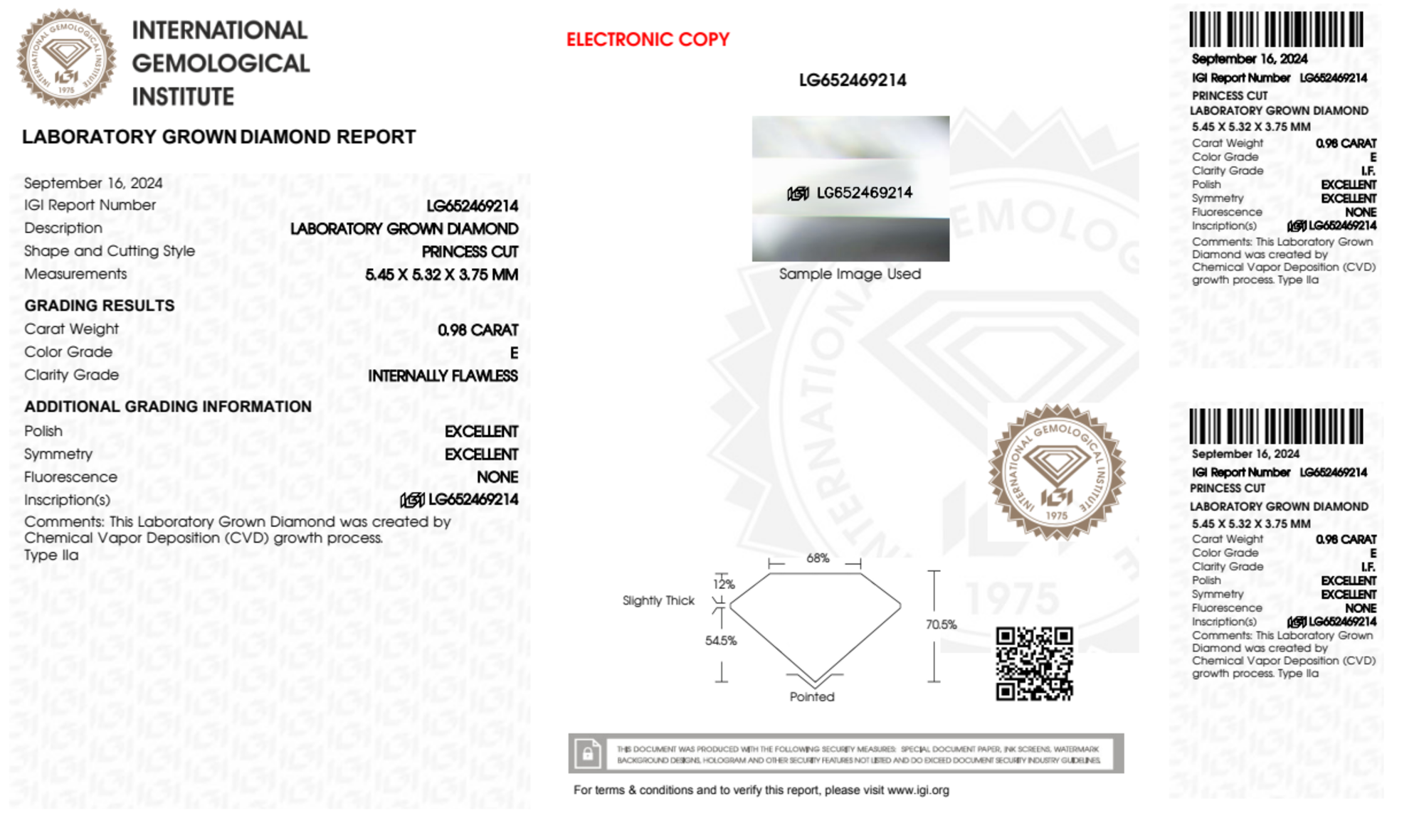 Your 0.98 carat Princess lab diamond is graded IF clarity, which stands for Internally Flawless. Read more about IF clarity diamonds here, or learn more about diamond clarity in general here.
