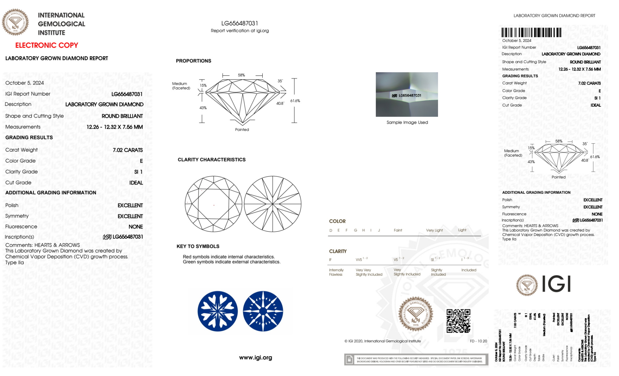Your 7.02 carat Round lab diamond is graded E color (Colorless), and you can read more about E color diamonds here.