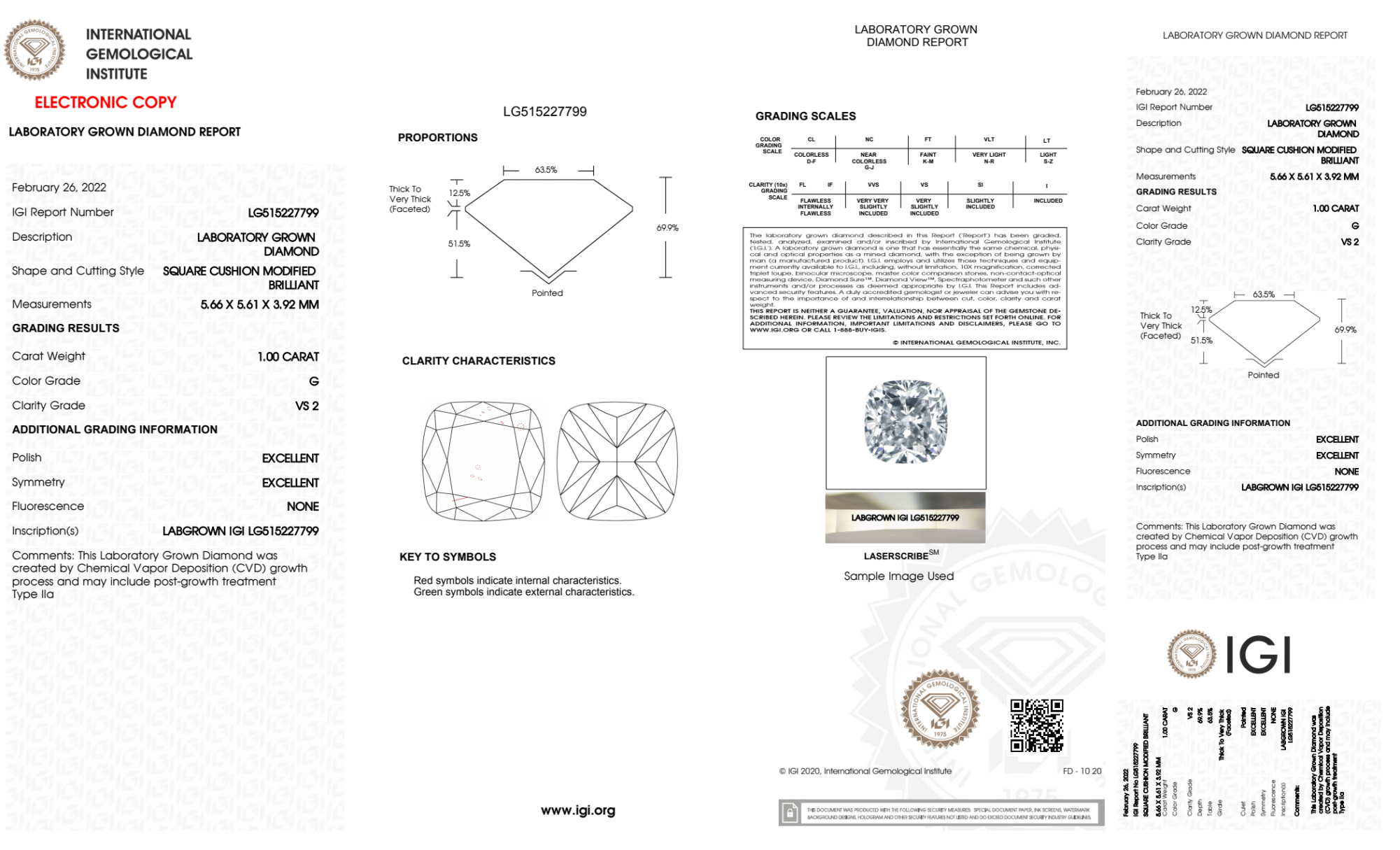 Your 1.00 carat Cushion lab diamond is graded G color (Near Colorless), and you can read more about G color diamonds here.