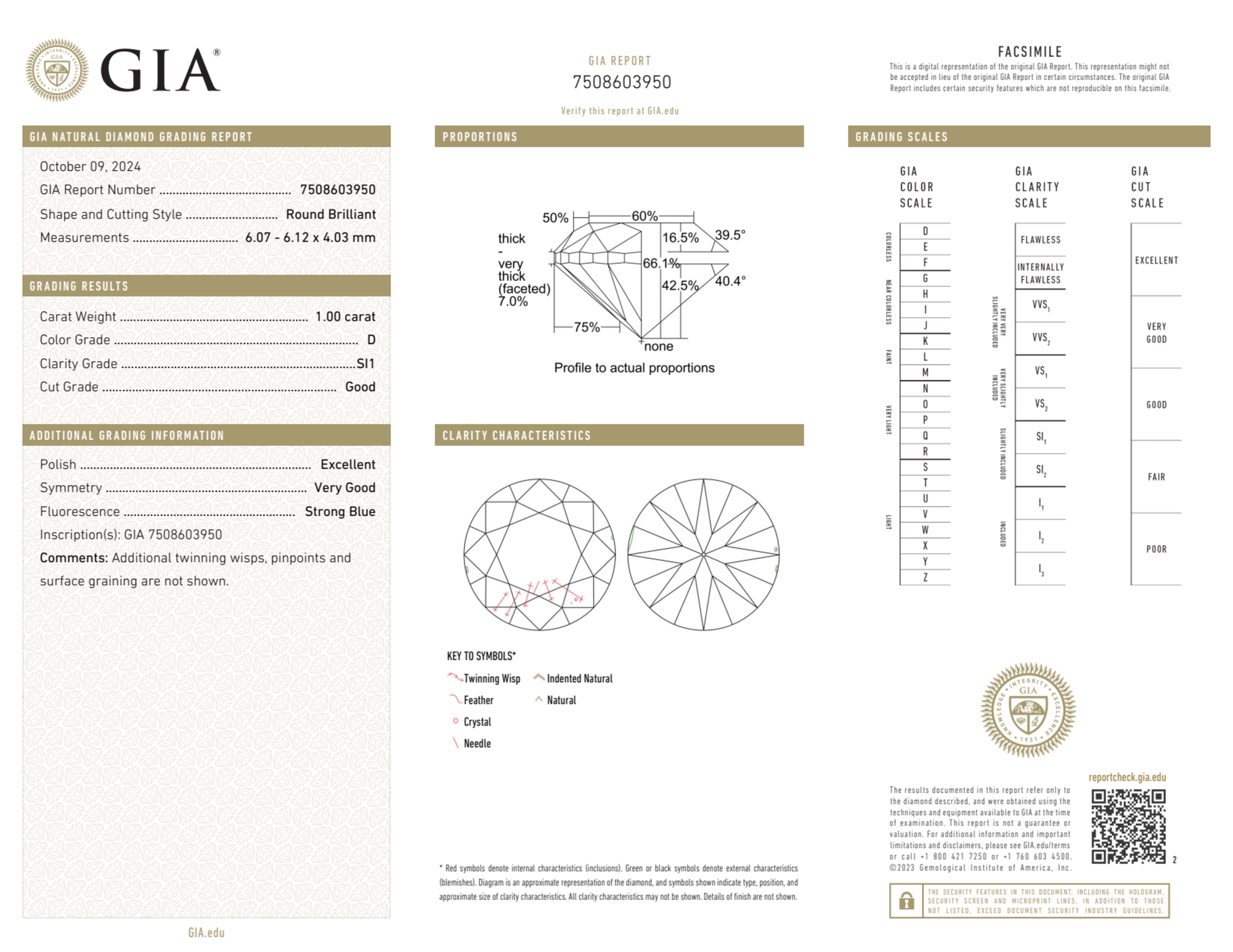 Your 1.00 carat Round natural diamond is graded D color (Colorless), and you can read more about D color diamonds here.
