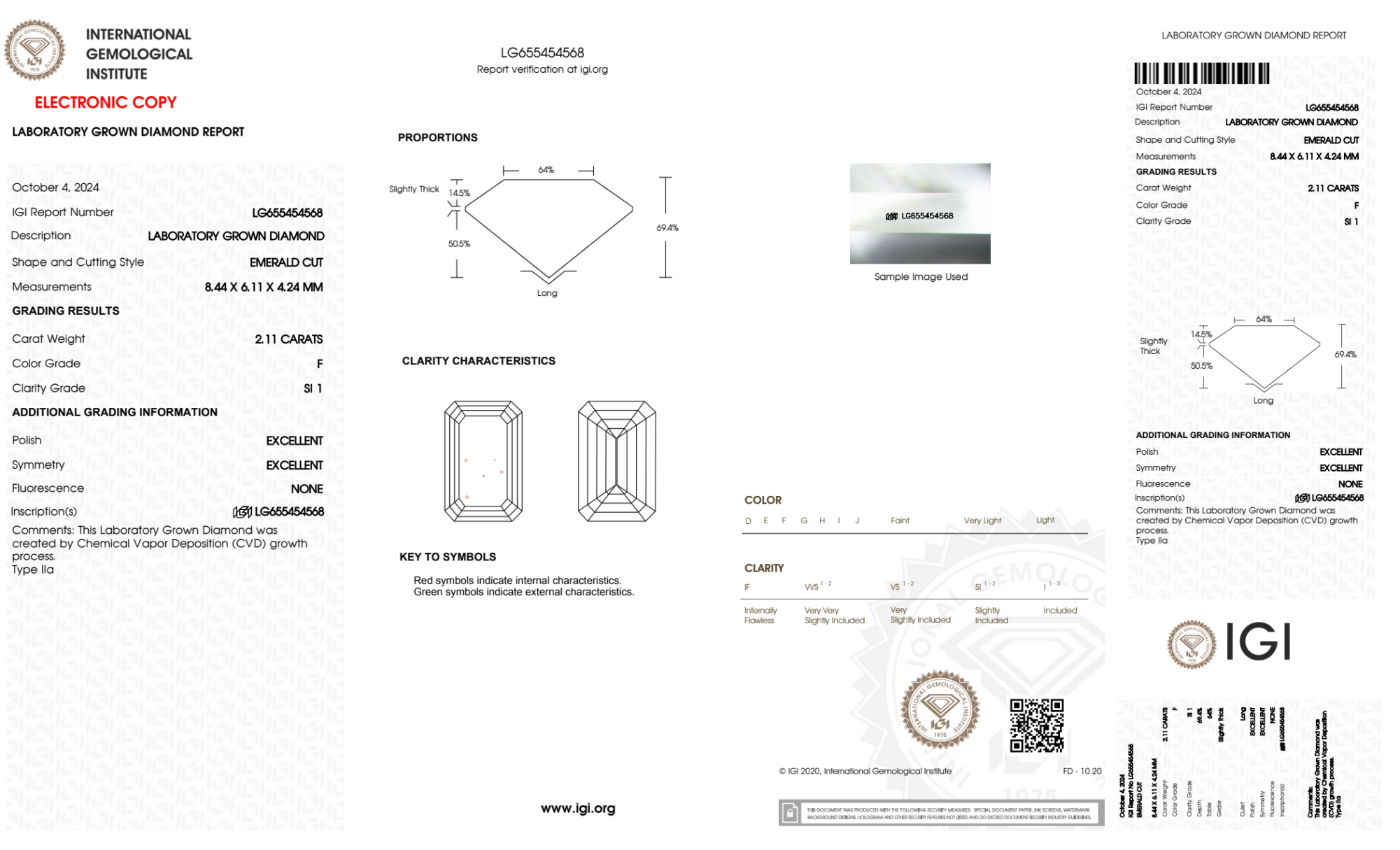 Your 2.11 carat Emerald lab diamond is graded F color (Colorless), and you can read more about F color diamonds here.