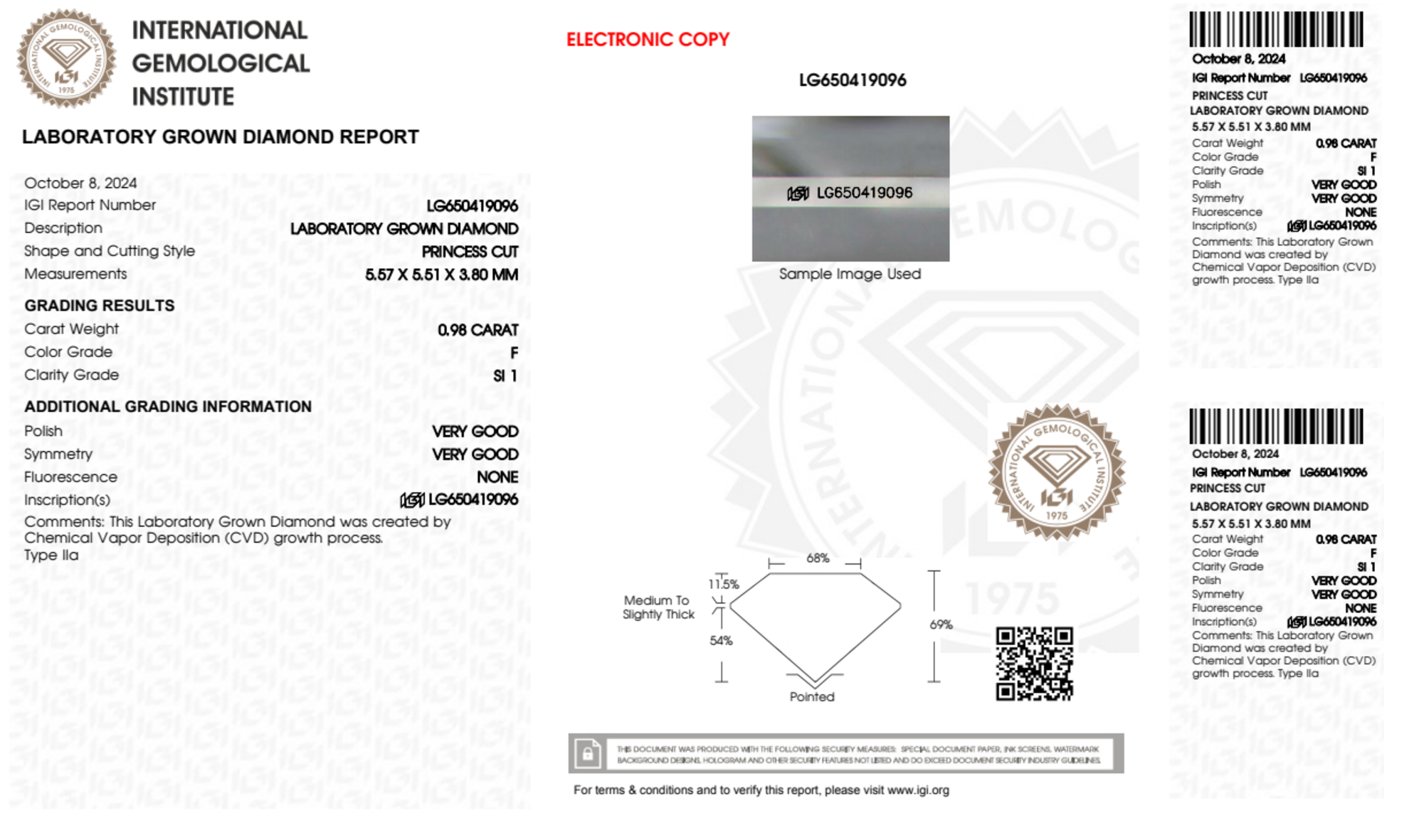 Your 0.98 carat Princess lab diamond is graded SI1 clarity, which stands for Slightly Included 1. Read more about SI1 clarity diamonds here, or learn more about diamond clarity in general here.