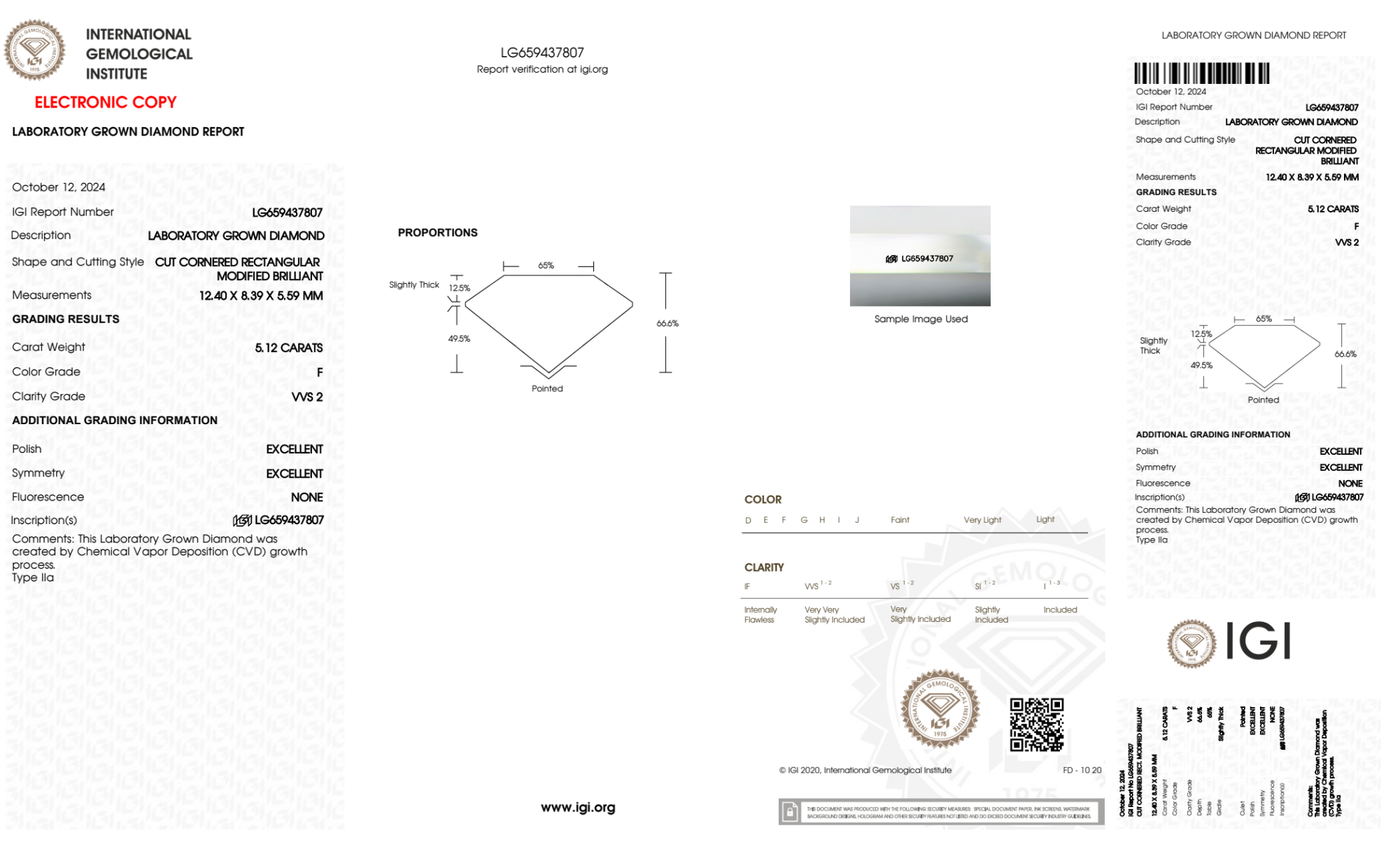 Your 5.12 carat Radiant lab diamond is graded F color (Colorless), and you can read more about F color diamonds here.