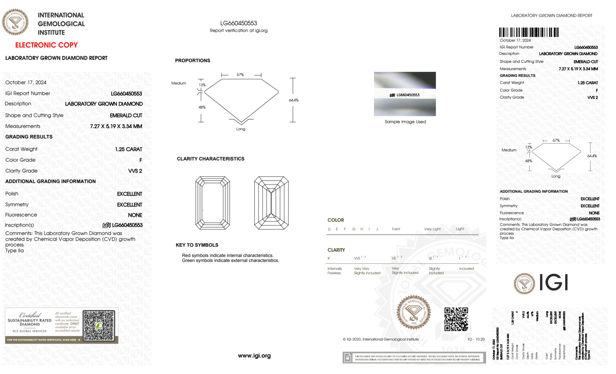 Your 1.25 carat Emerald lab diamond is graded F color (Colorless), and you can read more about F color diamonds here.