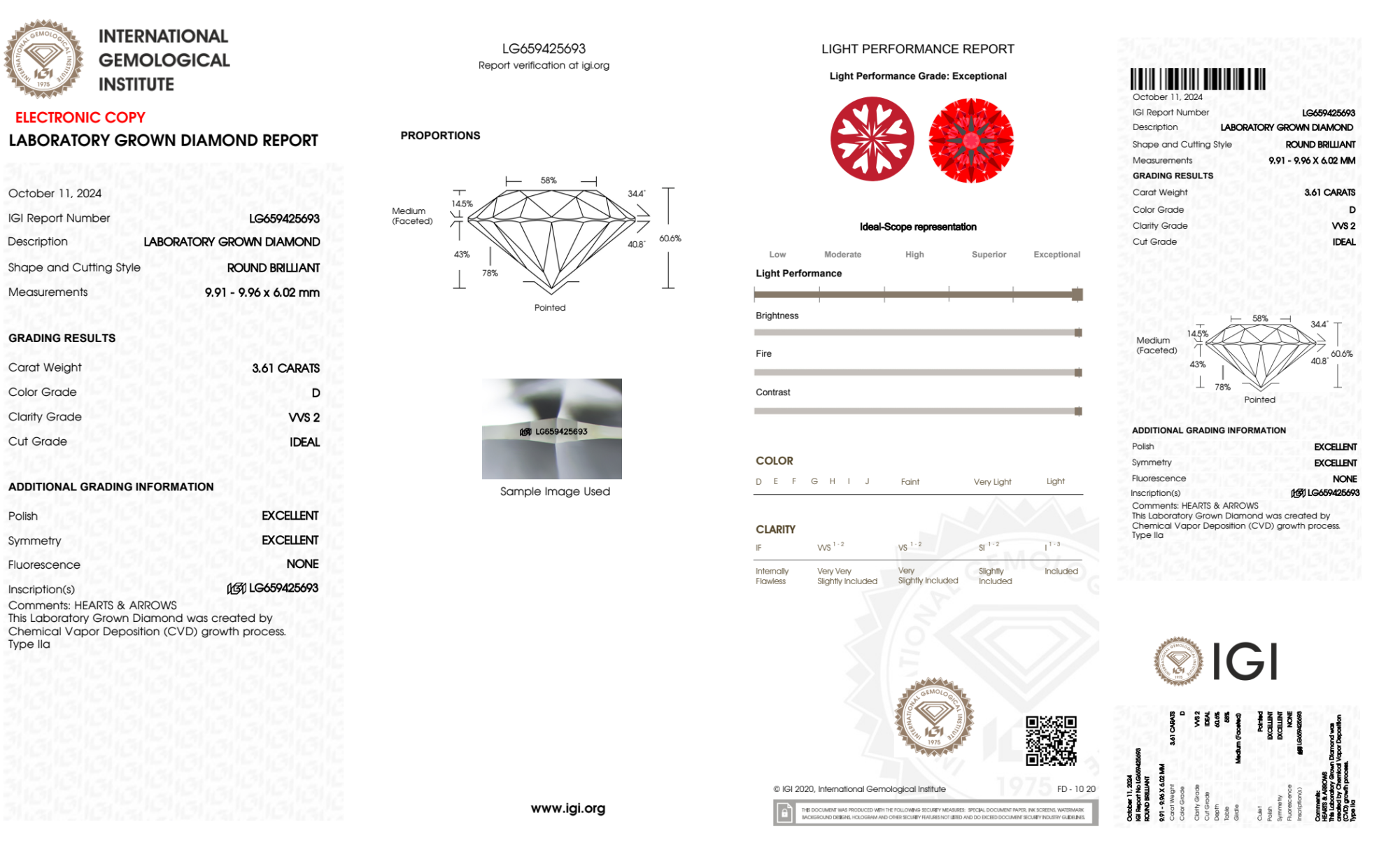 Your 3.61 carat Round lab diamond is graded D color (Colorless), and you can read more about D color diamonds here.