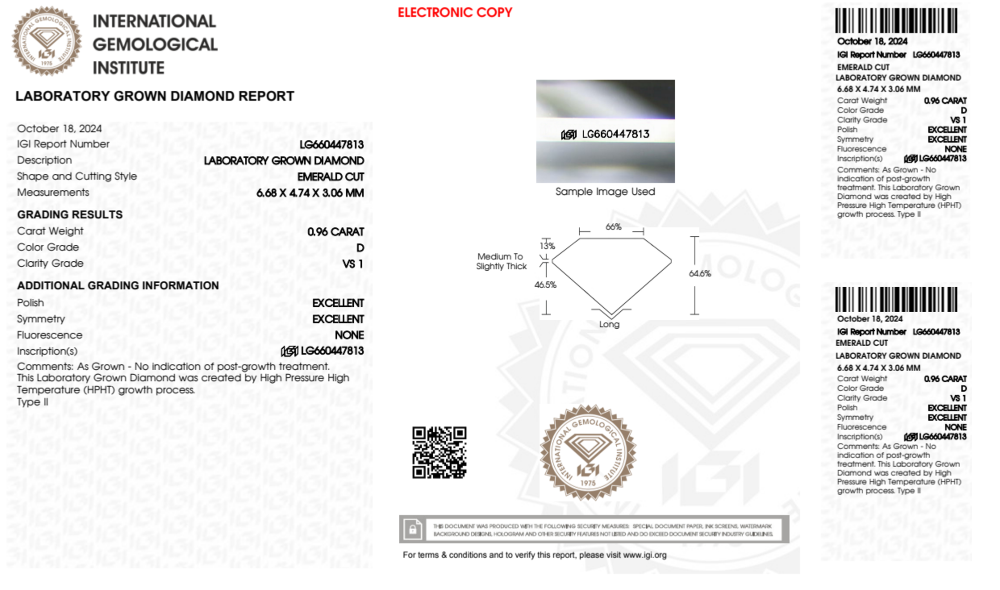 Your 0.96 carat Emerald lab diamond is graded D color (Colorless), and you can read more about D color diamonds here.