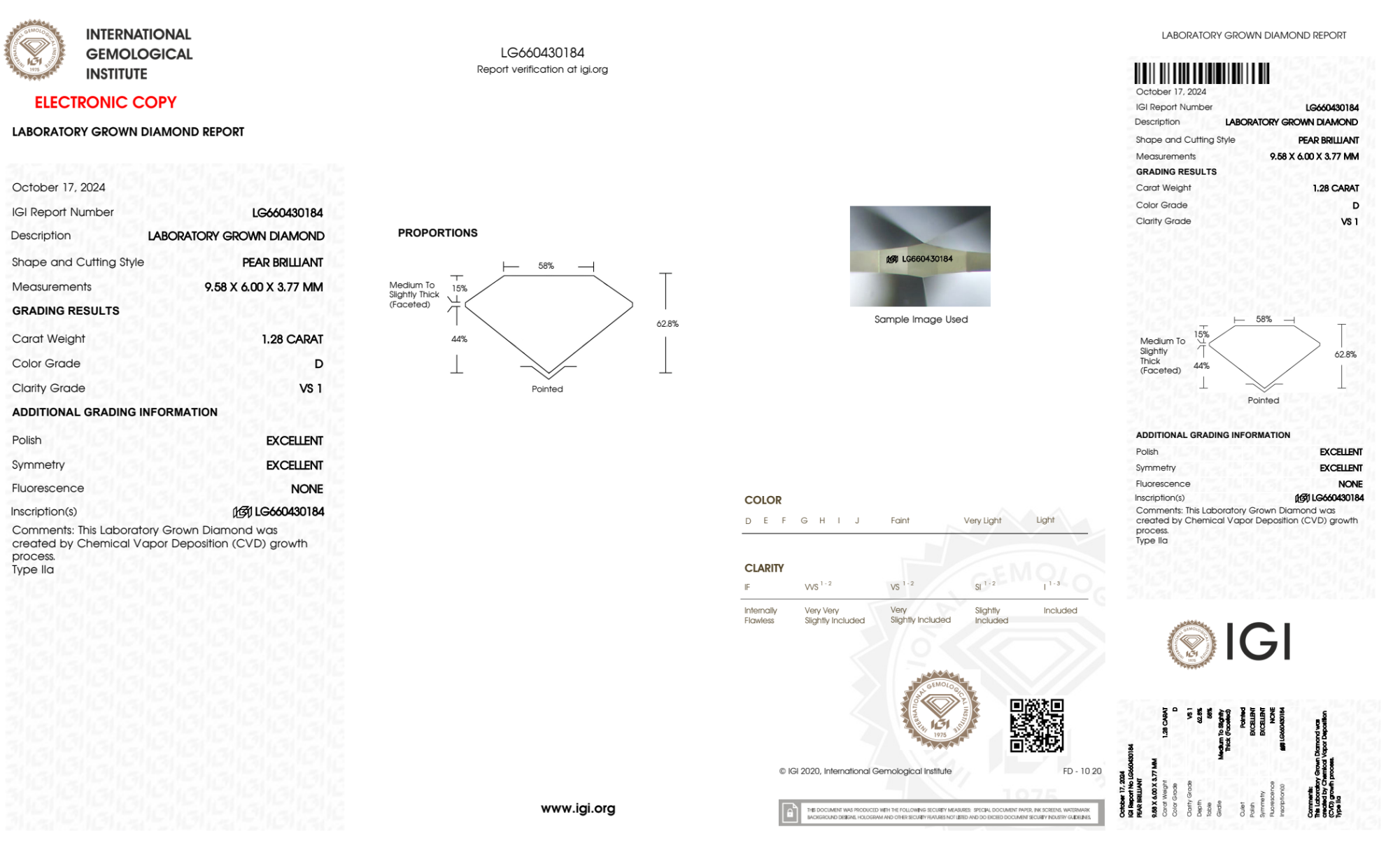 Your 1.28 carat Pear lab diamond is graded D color (Colorless), and you can read more about D color diamonds here.