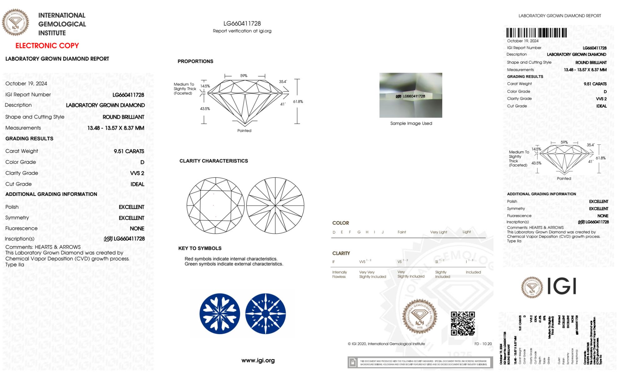 Your 9.51 carat Round lab diamond is graded D color (Colorless), and you can read more about D color diamonds here.