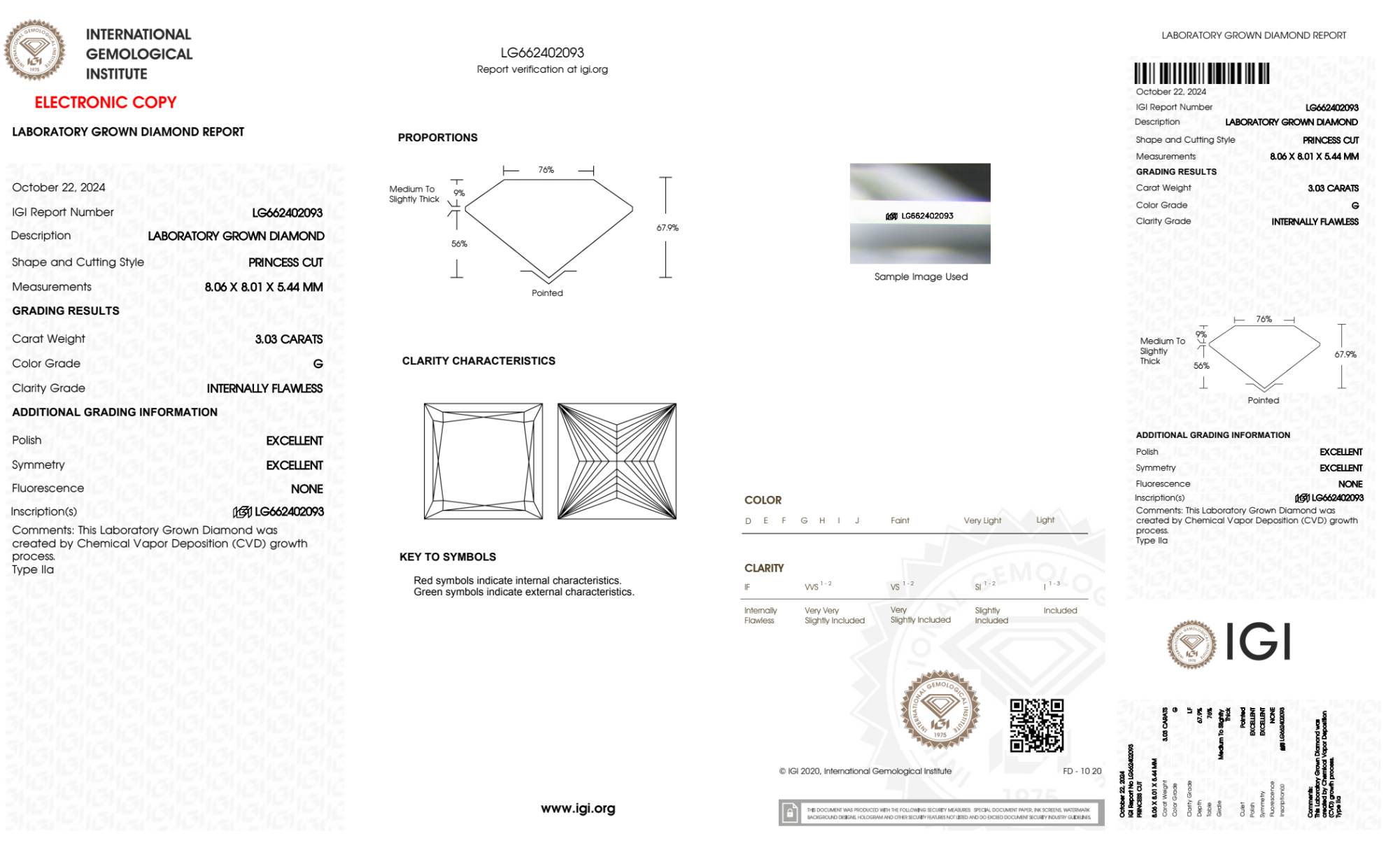 Your 3.03 carat Princess lab diamond is graded IF clarity, which stands for Internally Flawless. Read more about IF clarity diamonds here, or learn more about diamond clarity in general here.