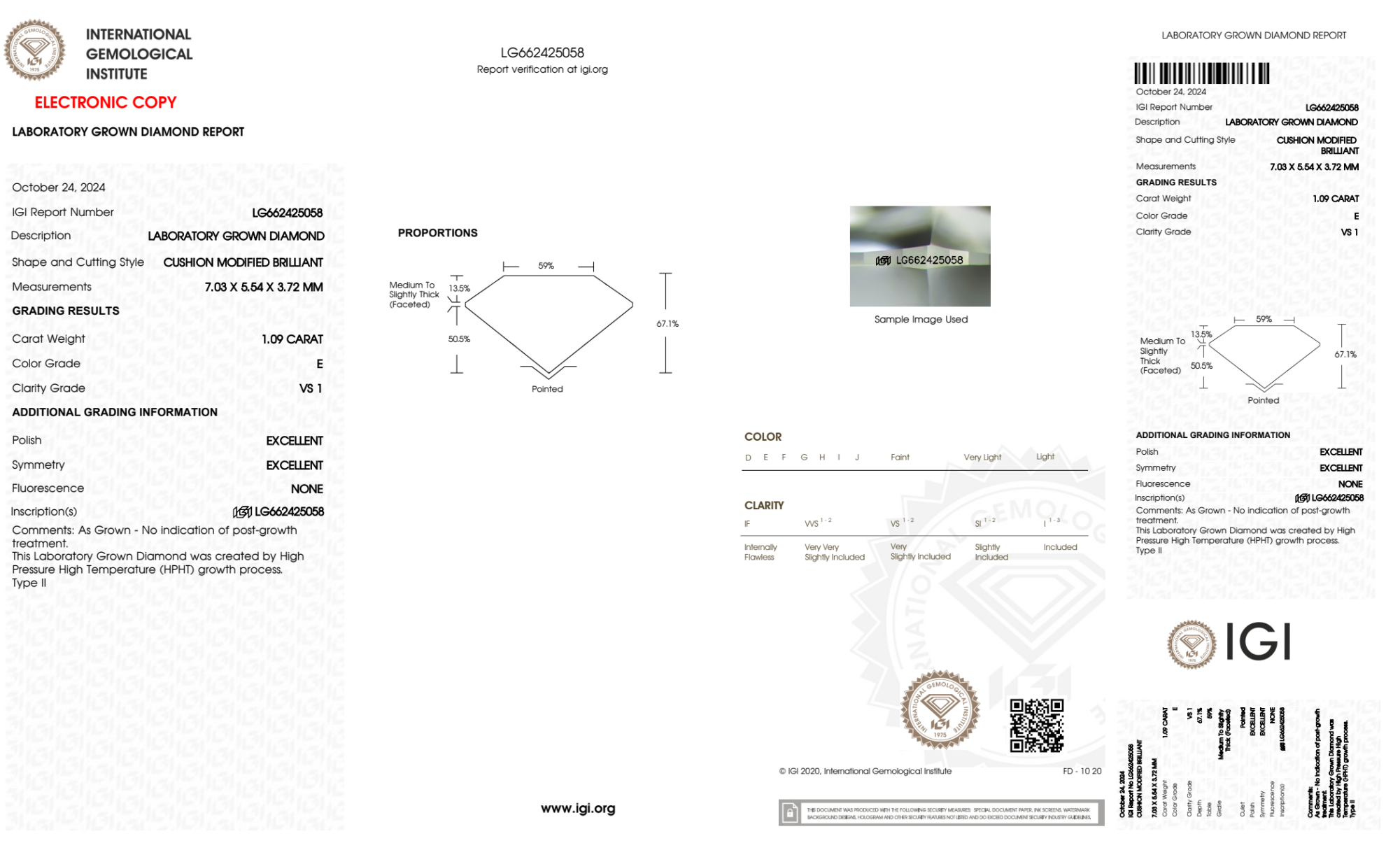 Your 1.09 carat Cushion lab diamond is graded E color (Colorless), and you can read more about E color diamonds here.