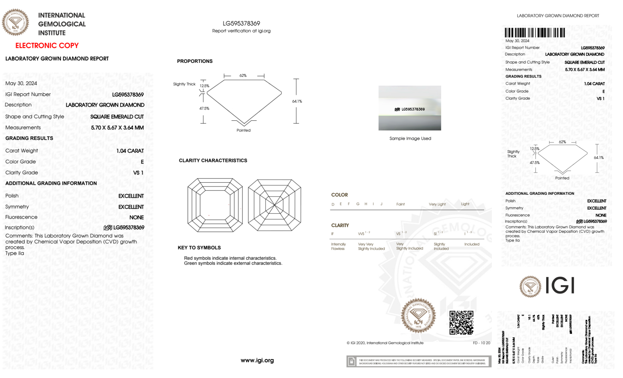 Your 1.04 carat Asscher lab diamond is graded E color (Colorless), and you can read more about E color diamonds here.