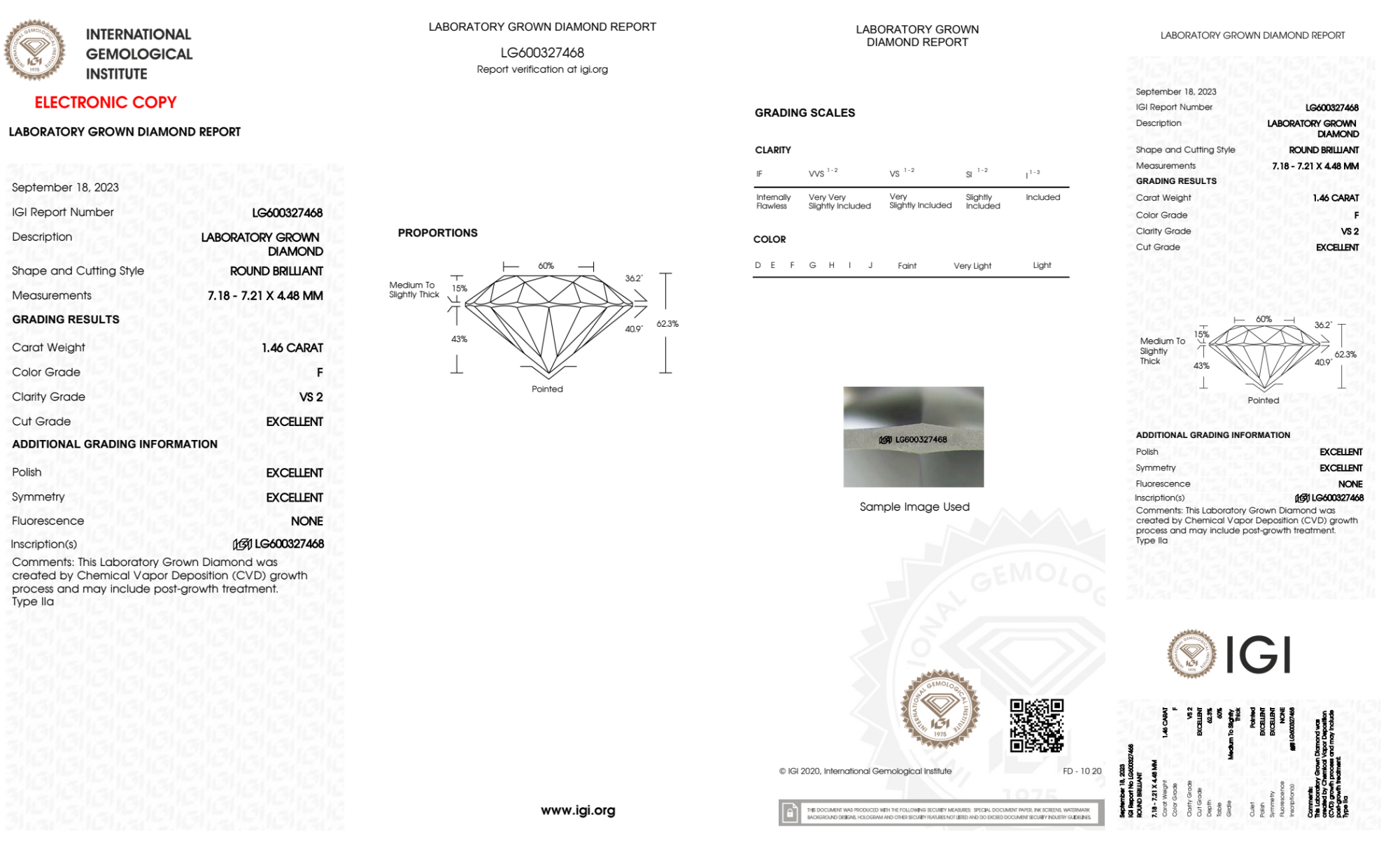 Your 1.46 carat Round lab diamond is graded F color (Colorless), and you can read more about F color diamonds here.