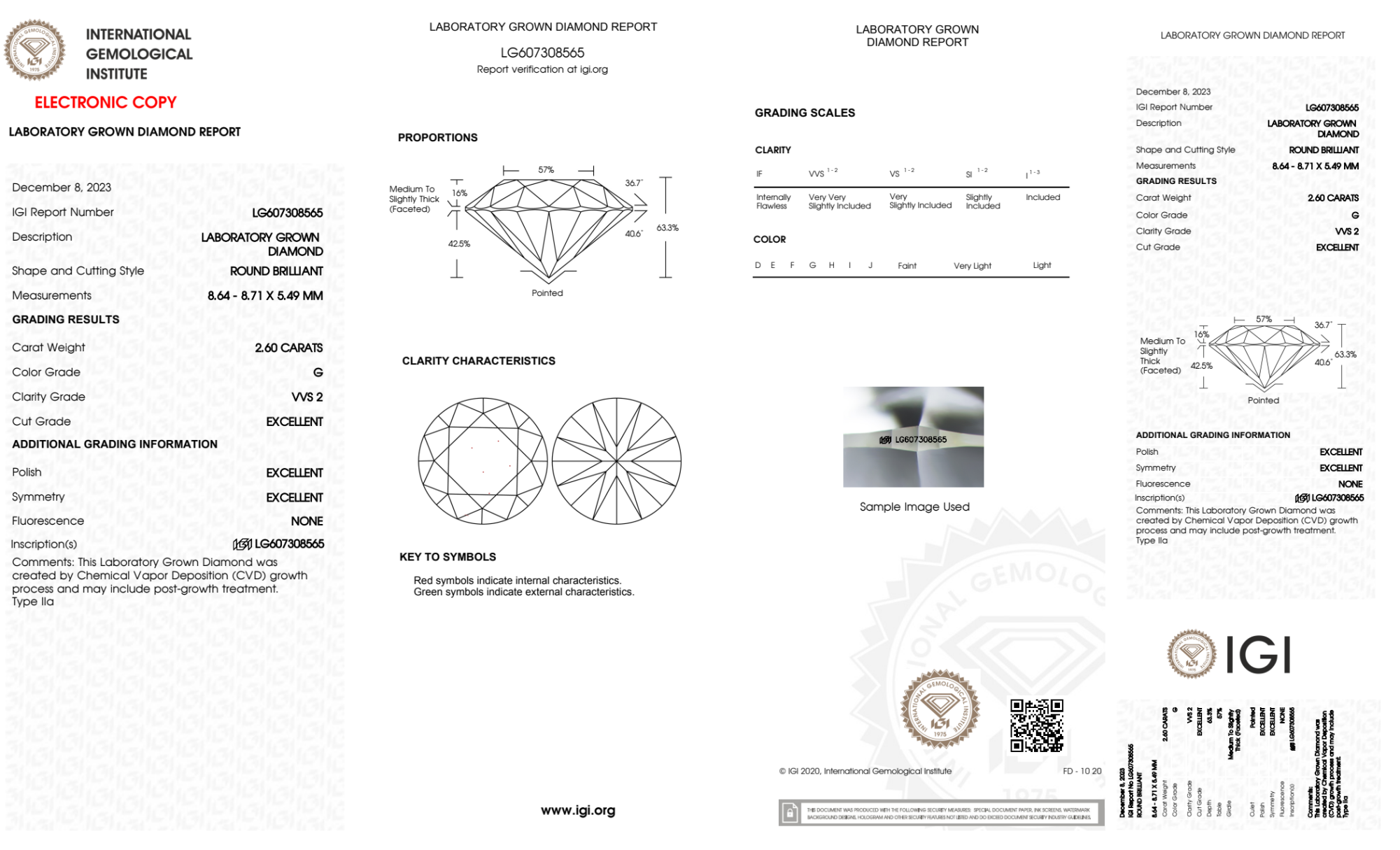 Your 2.60 carat Round lab diamond is graded G color (Near Colorless), and you can read more about G color diamonds here.