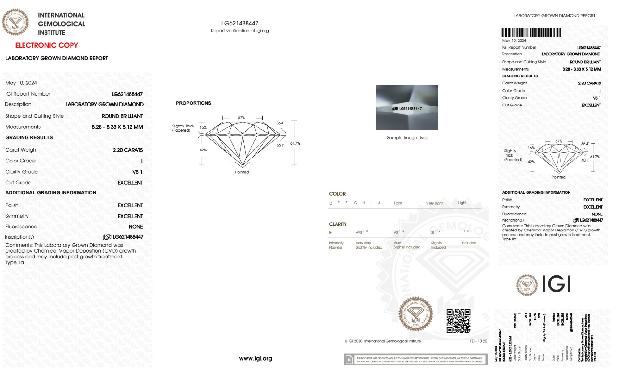 Your 2.20 carat Round lab diamond is graded I color (Near Colorless), and you can read more about I color diamonds here.