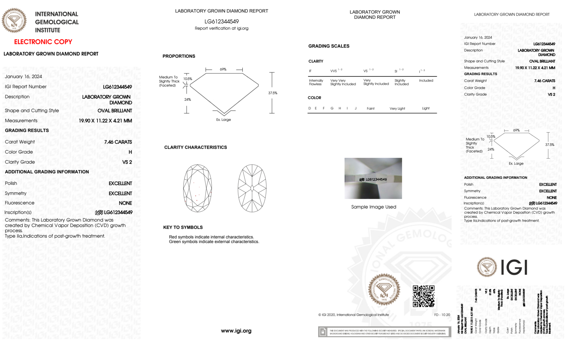 Your 7.46 carat Oval lab diamond is graded VS2 clarity, which stands for Very Slightly Included 2. Read more about VS2 clarity diamonds here, or learn more about diamond clarity in general here.