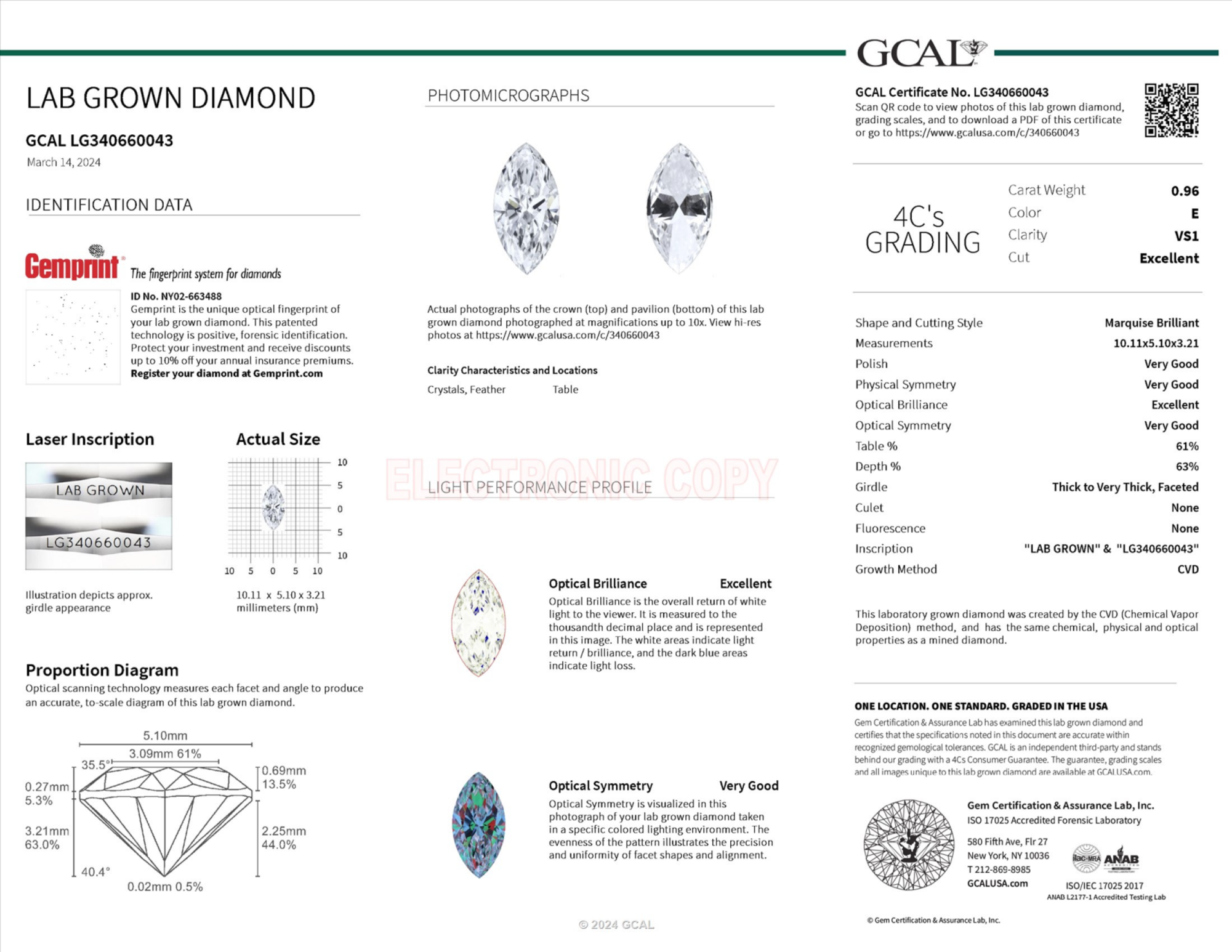 Your 0.96 carat Marquise lab diamond is graded E color (Colorless), and you can read more about E color diamonds here.