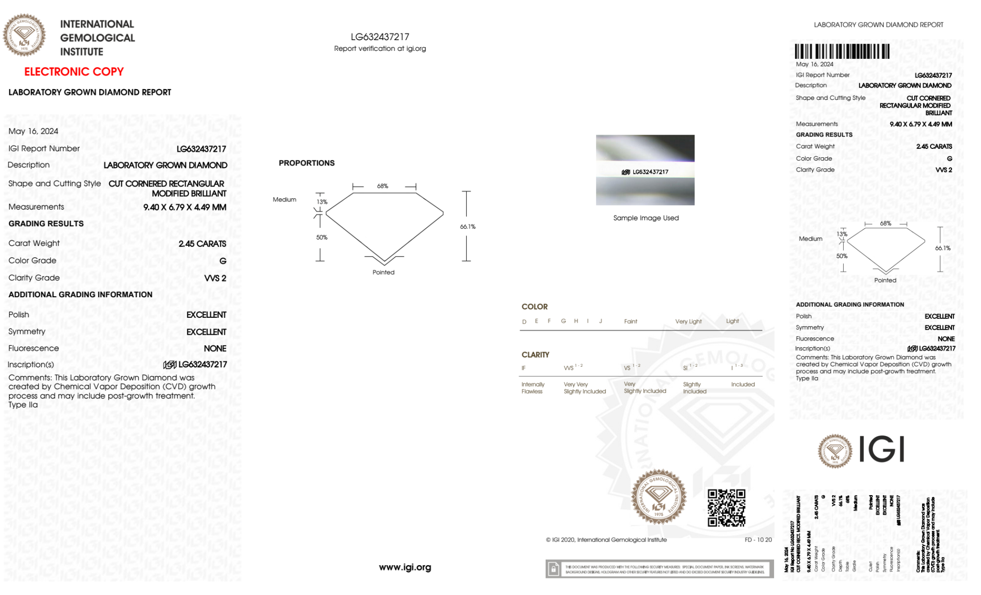 Your 2.45 carat Radiant lab diamond is graded G color (Near Colorless), and you can read more about G color diamonds here.