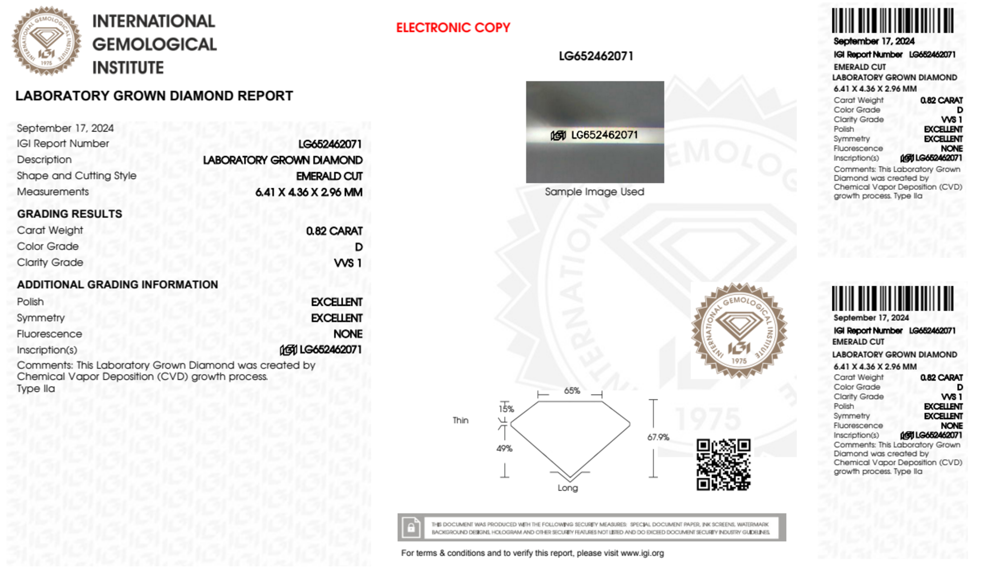 Your 0.82 carat Emerald lab diamond is graded D color (Colorless), and you can read more about D color diamonds here.