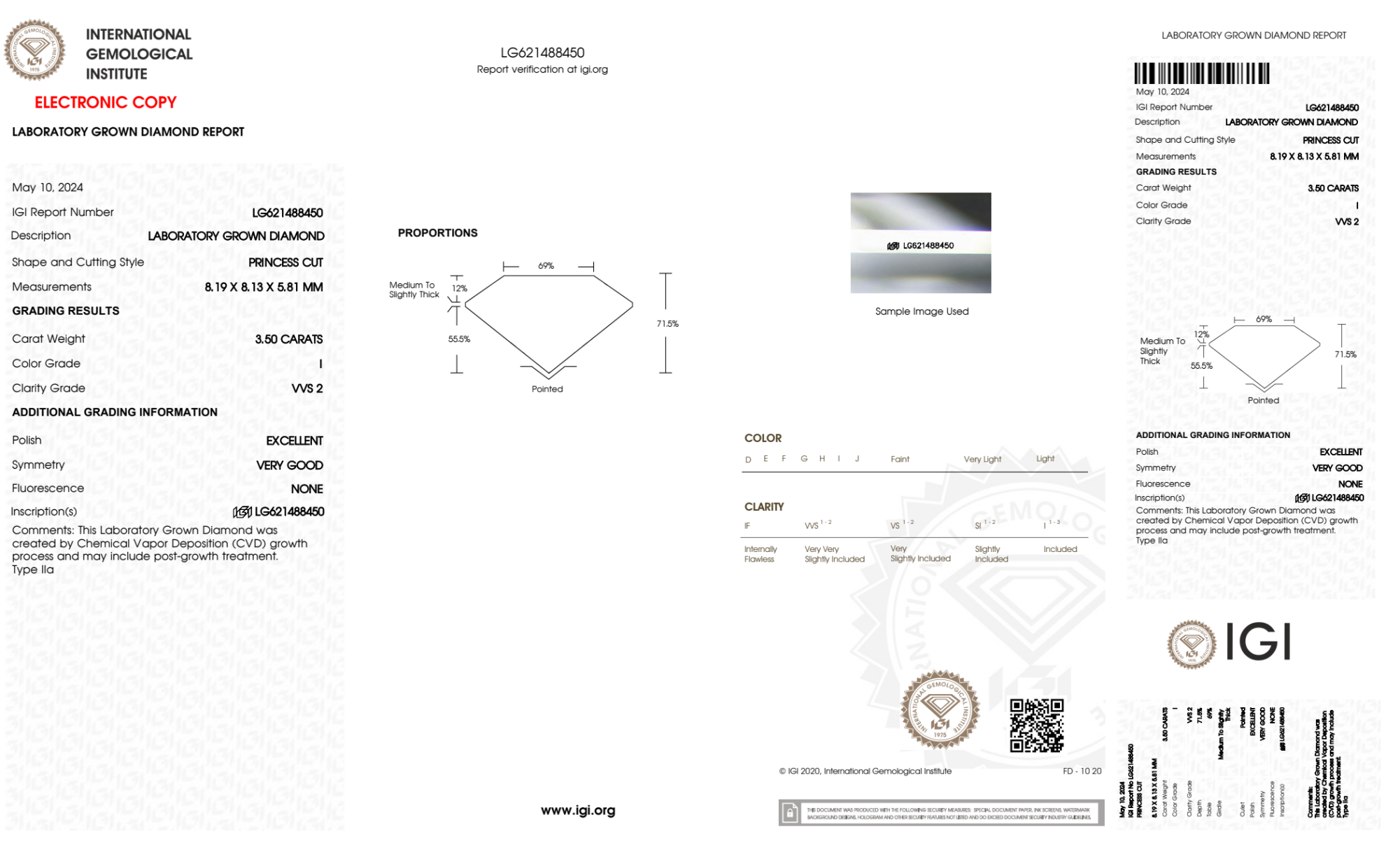 Your 3.50 carat Princess lab diamond is graded VVS2 clarity, which stands for Very Very Slightly Included 2. Read more about VVS2 clarity diamonds here, or learn more about diamond clarity in general here.