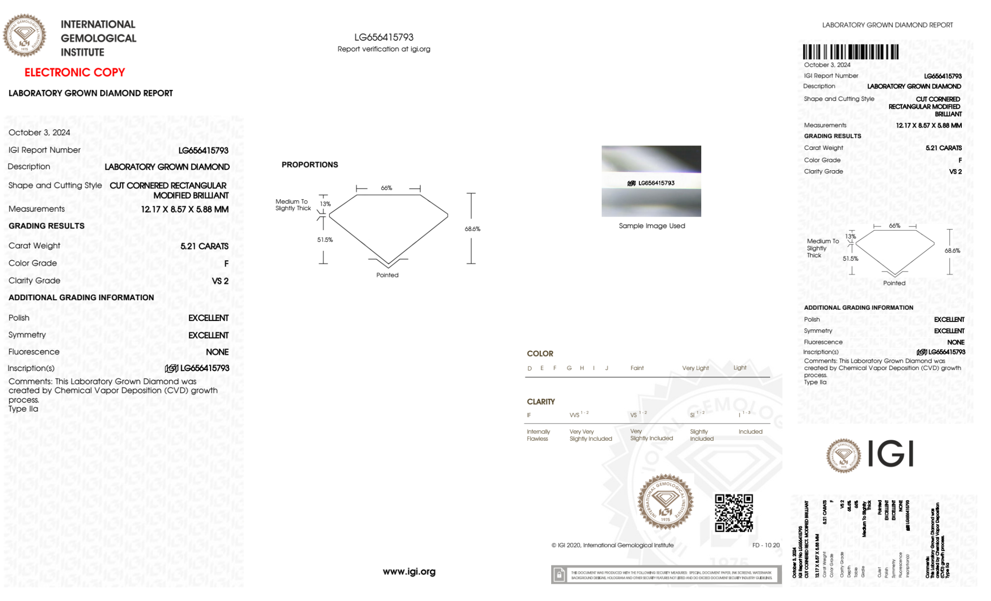 Your 5.21 carat Radiant lab diamond is graded F color (Colorless), and you can read more about F color diamonds here.