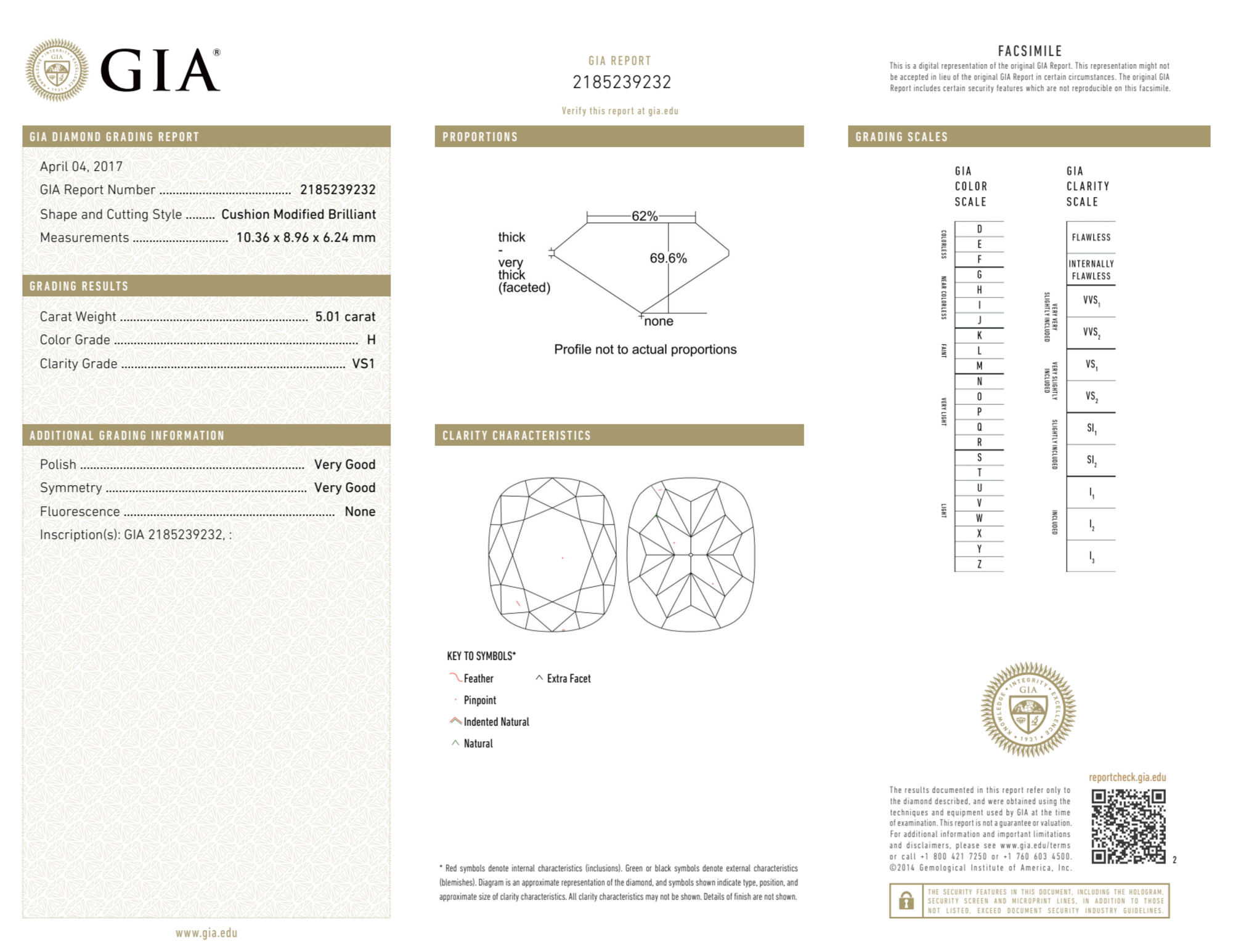 Your 5.01 carat Cushion natural diamond is graded VS1 clarity, which stands for Very Slightly Included 1. Read more about VS1 clarity diamonds here, or learn more about diamond clarity in general here.