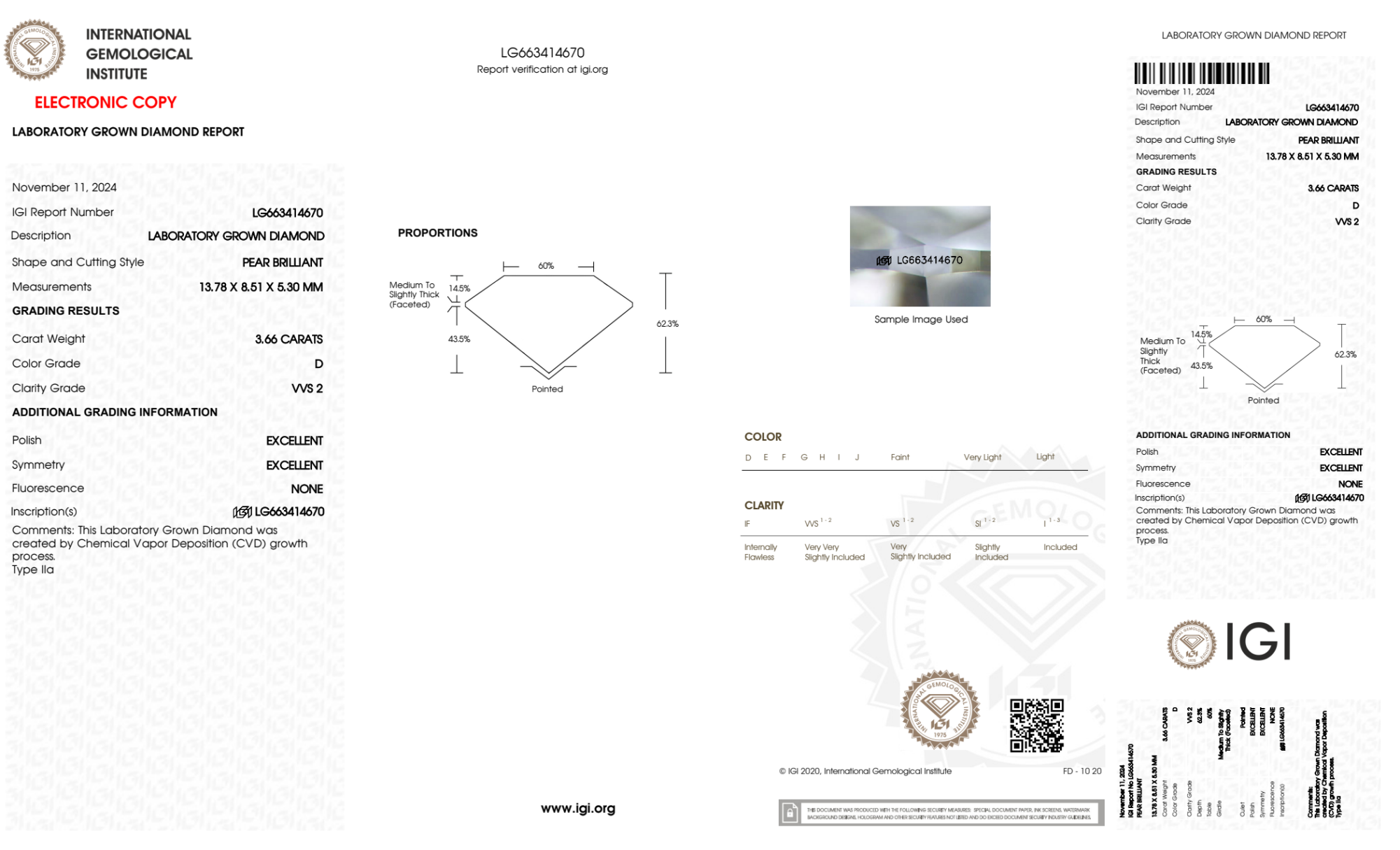 Your 3.66 carat Pear lab diamond is graded D color (Colorless), and you can read more about D color diamonds here.