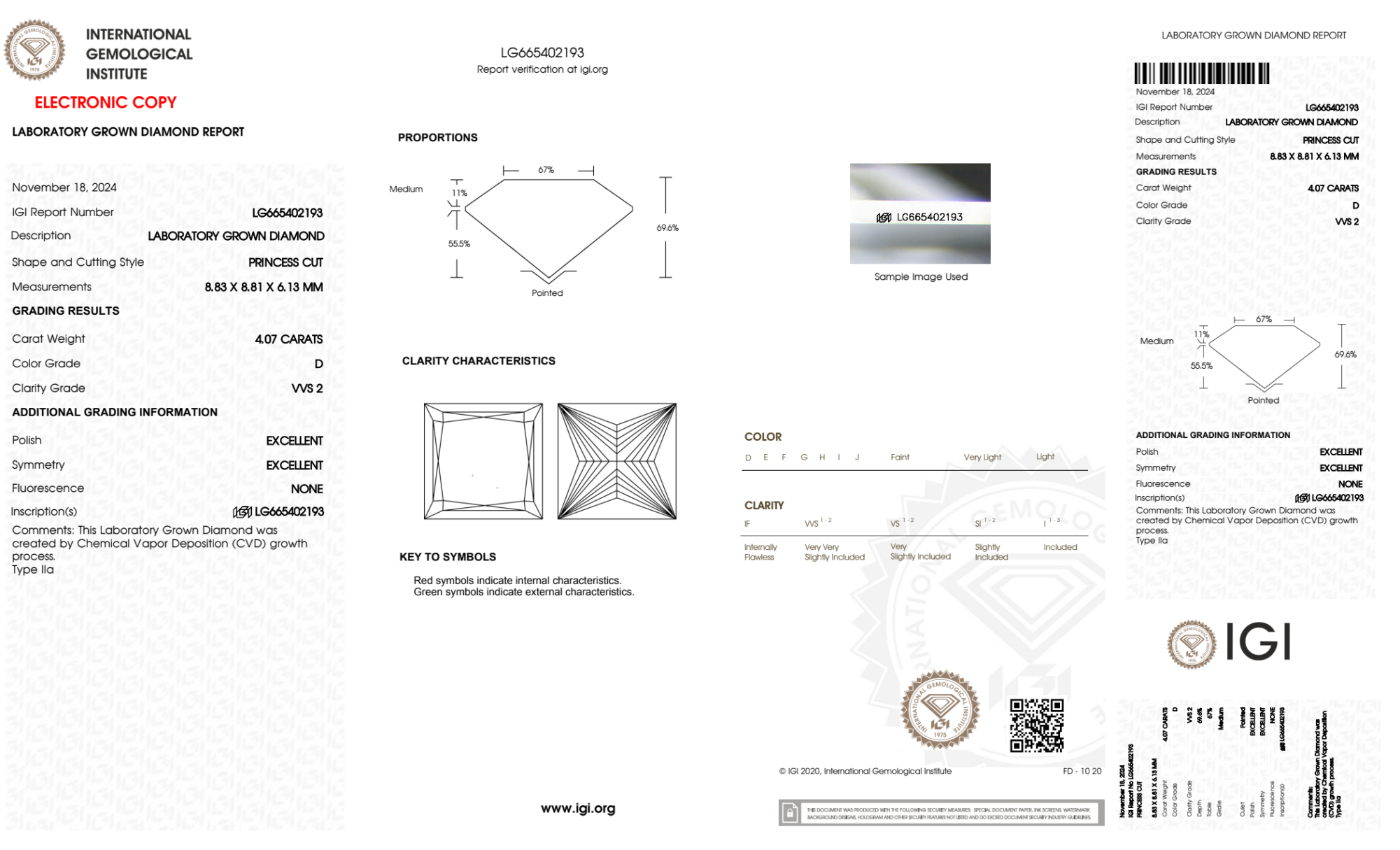 Your 4.07 carat Princess lab diamond is graded VVS2 clarity, which stands for Very Very Slightly Included 2. Read more about VVS2 clarity diamonds here, or learn more about diamond clarity in general here.