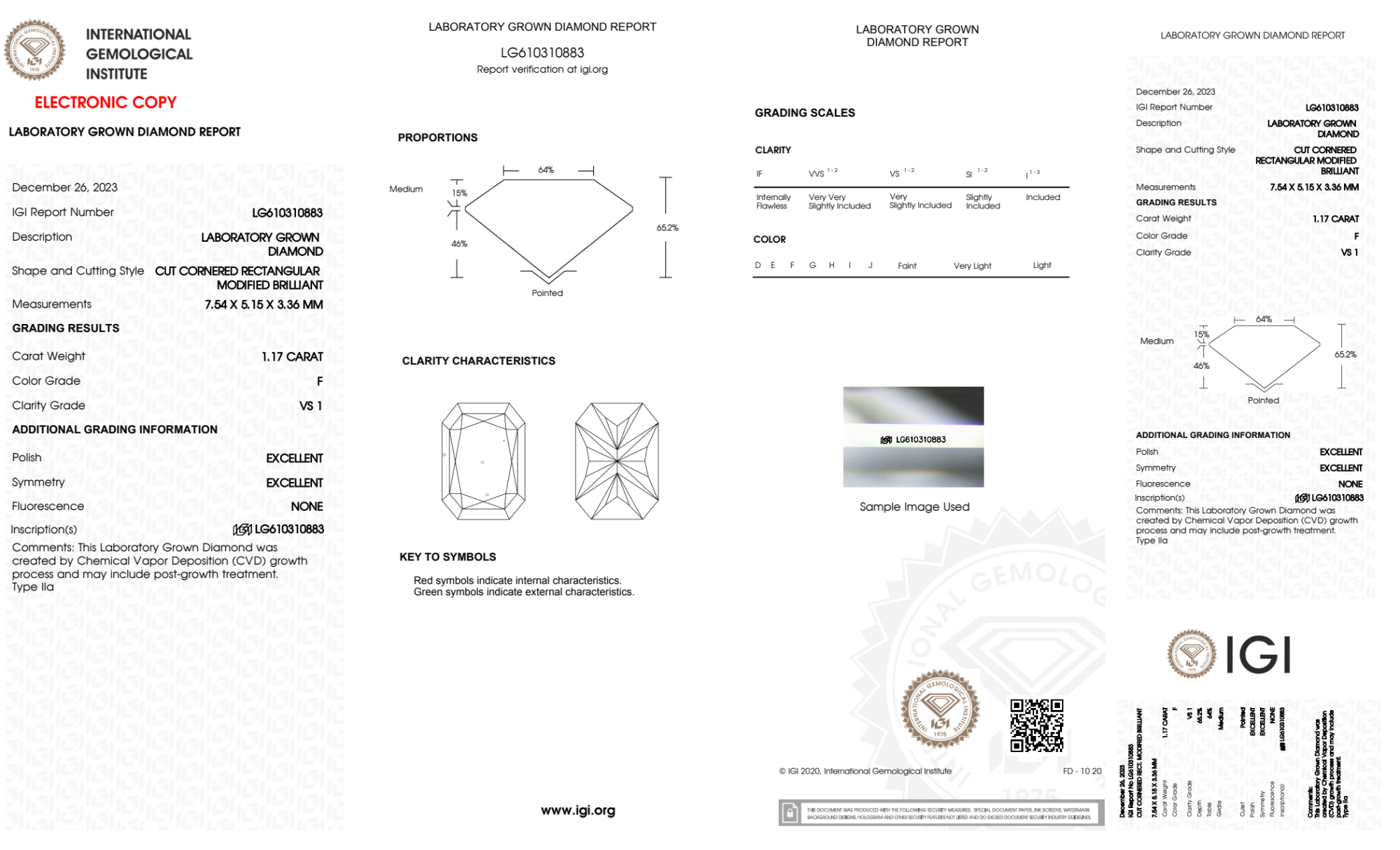 Your 1.17 carat Radiant lab diamond is graded F color (Colorless), and you can read more about F color diamonds here.