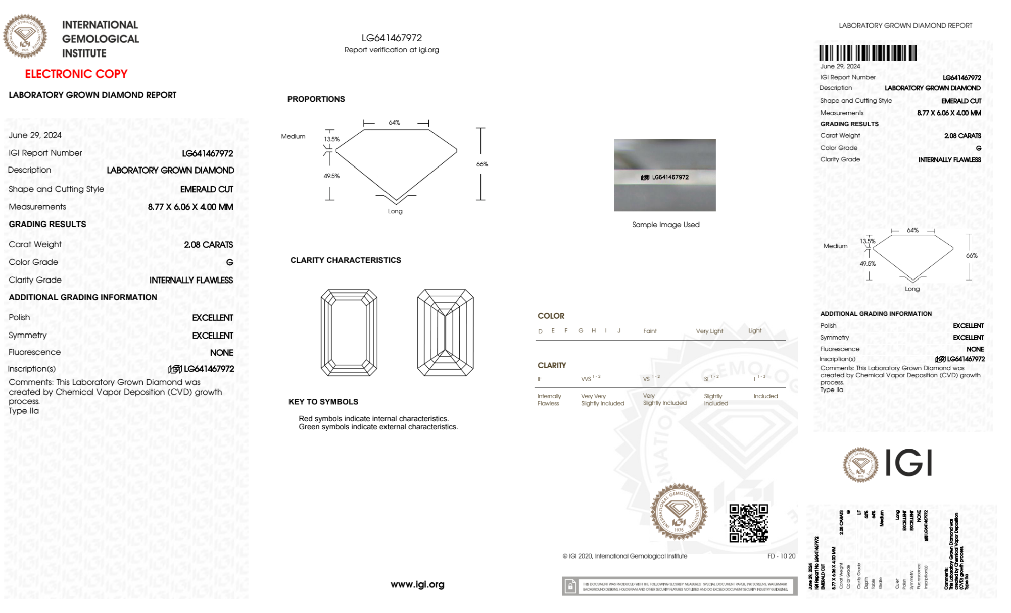 Your 2.08 carat Emerald lab diamond is graded IF clarity, which stands for Internally Flawless. Read more about IF clarity diamonds here, or learn more about diamond clarity in general here.