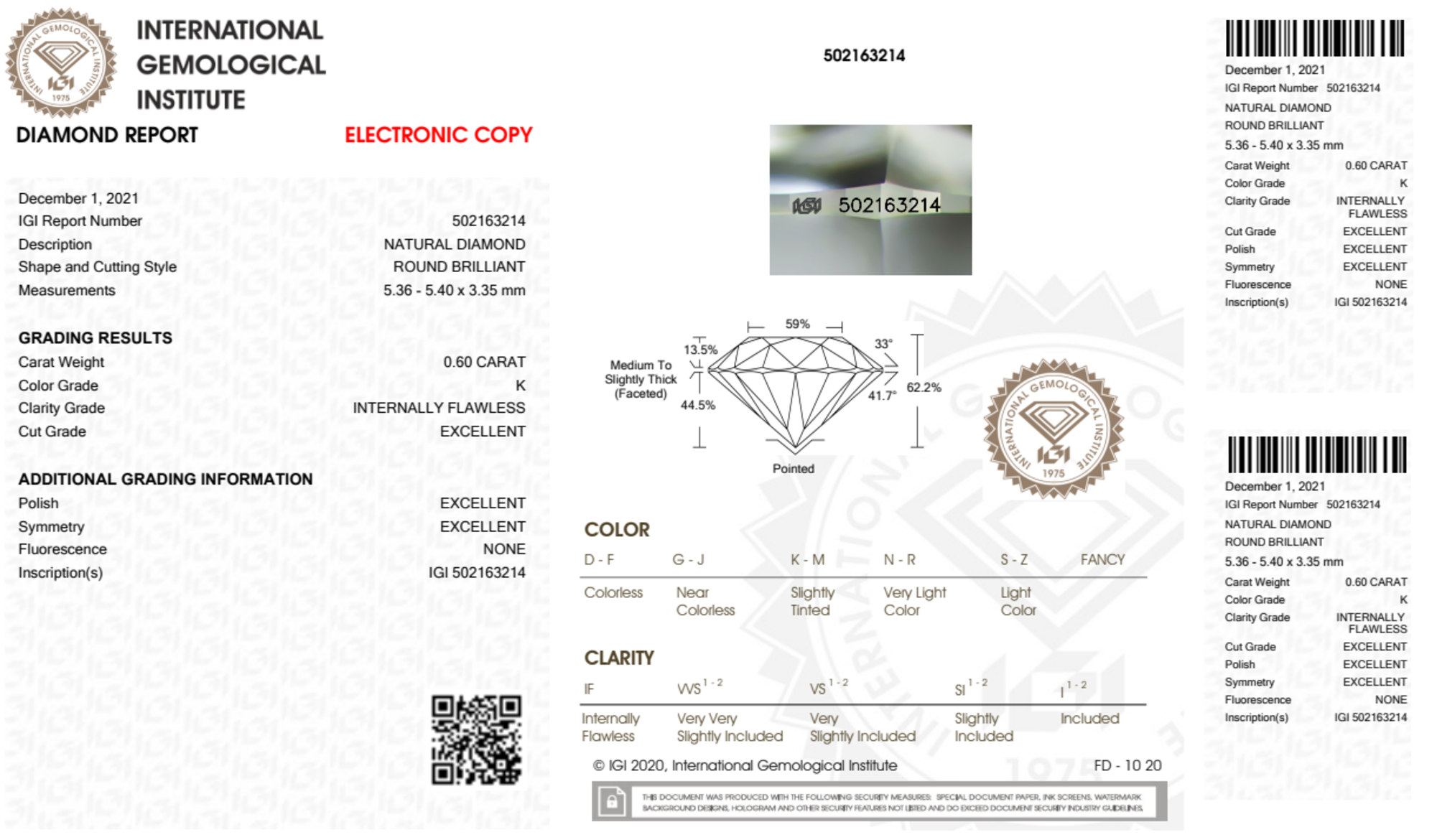 Your 0.60 carat Round natural diamond is graded K color (Faint Color), and you can read more about K color diamonds here.