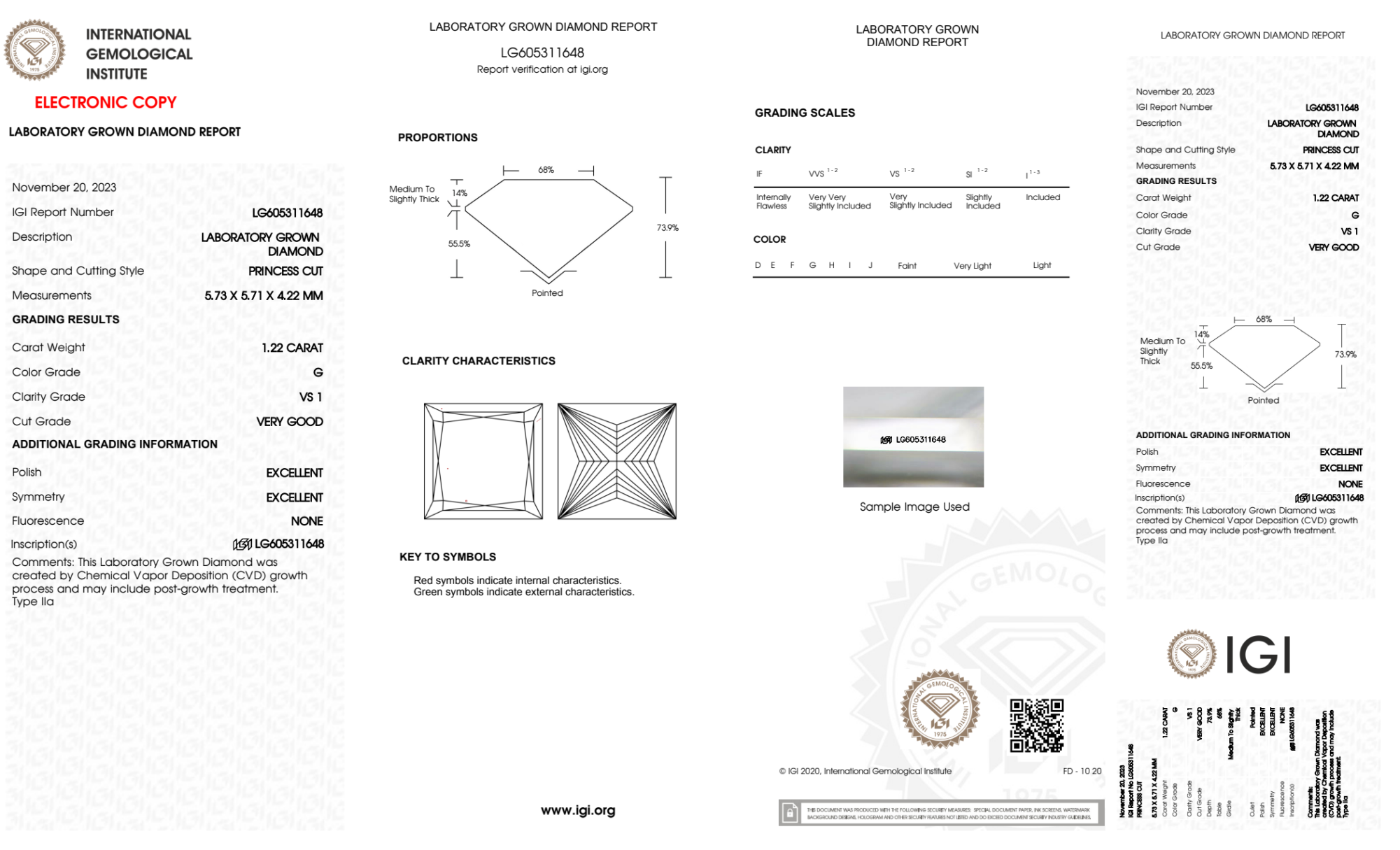 Your 1.22 carat Princess lab diamond is graded G color (Near Colorless), and you can read more about G color diamonds here.