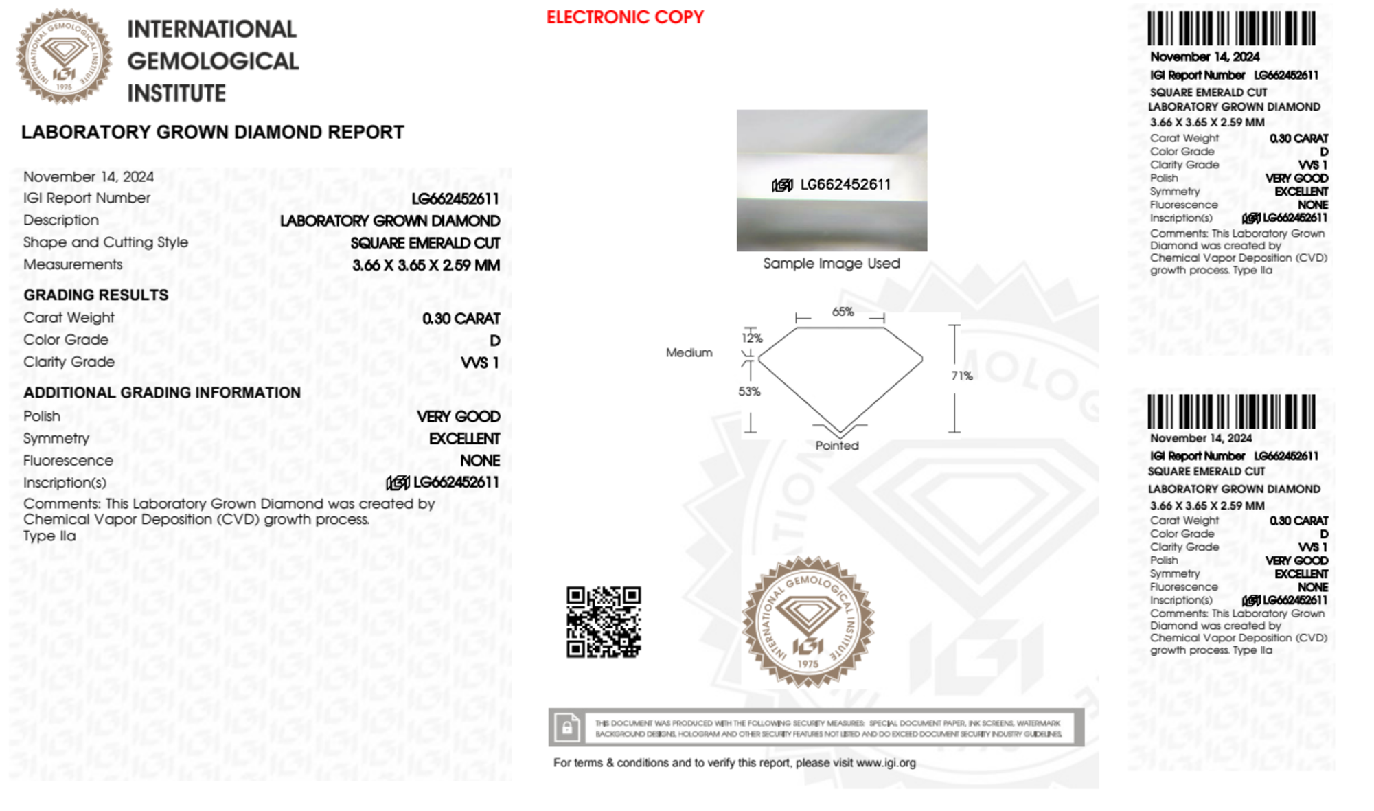 Your 0.30 carat Asscher lab diamond is graded D color (Colorless), and you can read more about D color diamonds here.