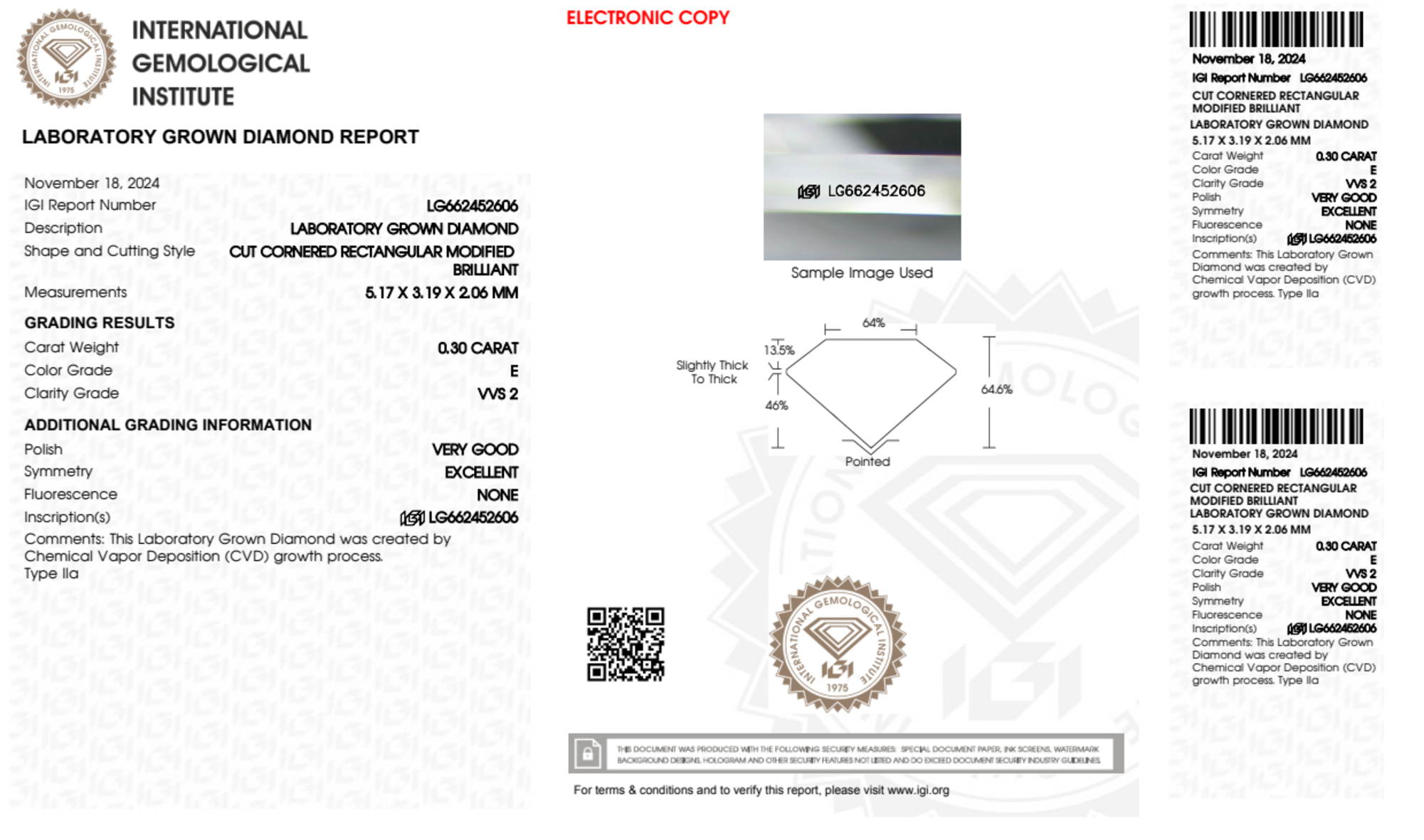Your 0.30 carat Radiant lab diamond is graded E color (Colorless), and you can read more about E color diamonds here.