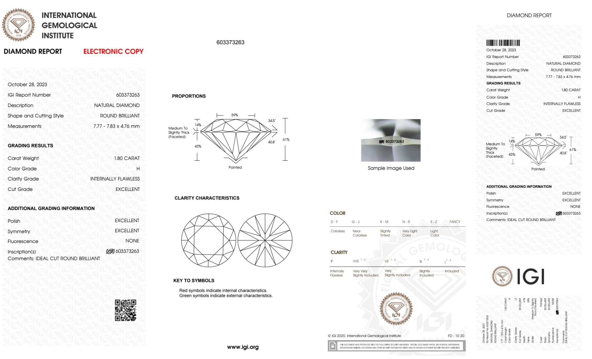 Your 1.80 carat Round natural diamond is graded IF clarity, which stands for Internally Flawless. Read more about IF clarity diamonds here, or learn more about diamond clarity in general here.