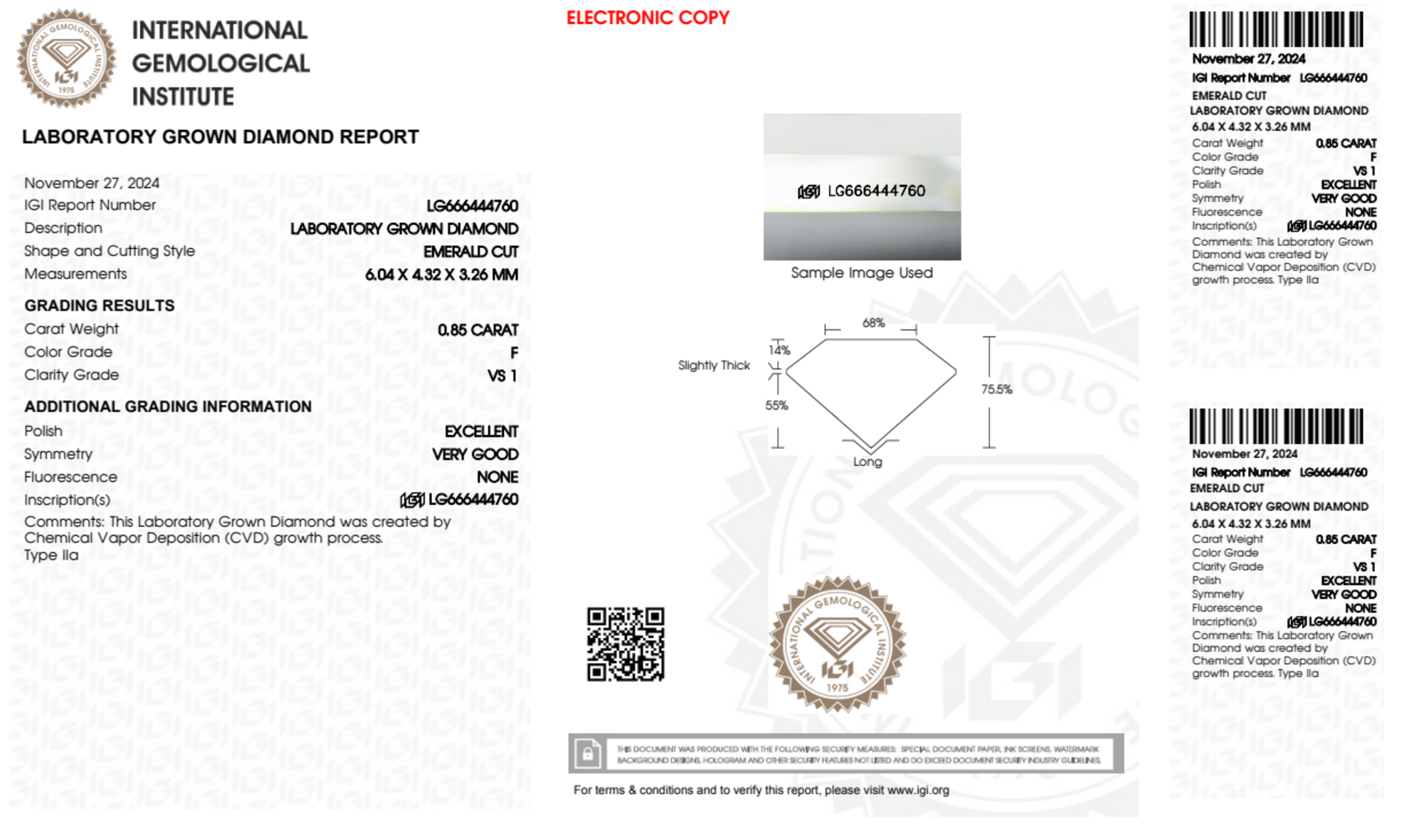 Your 0.85 carat Emerald lab diamond is graded F color (Colorless), and you can read more about F color diamonds here.