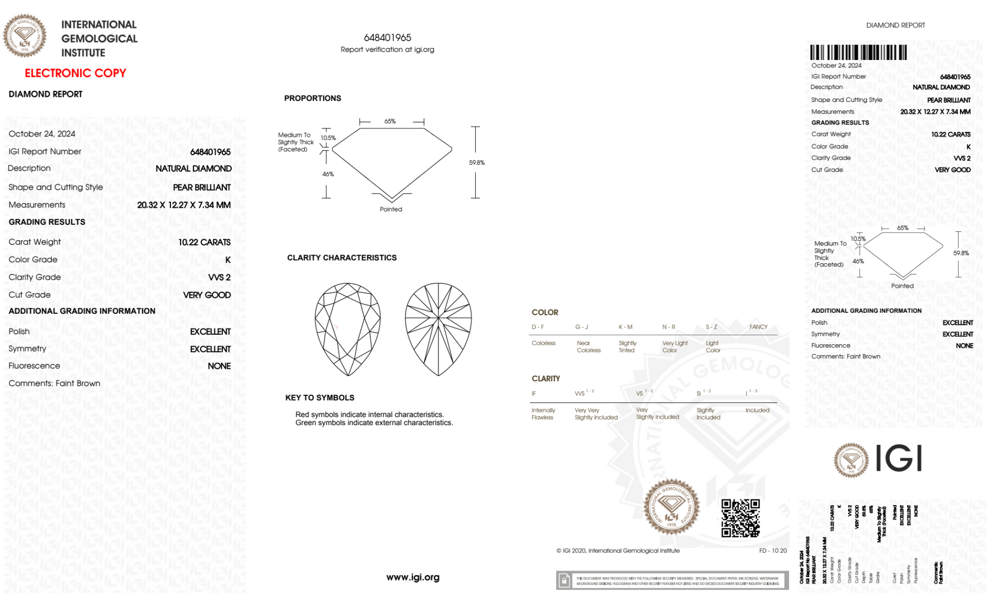 Your 10.22 carat Pear natural diamond is graded K color (Faint Color), and you can read more about K color diamonds here.