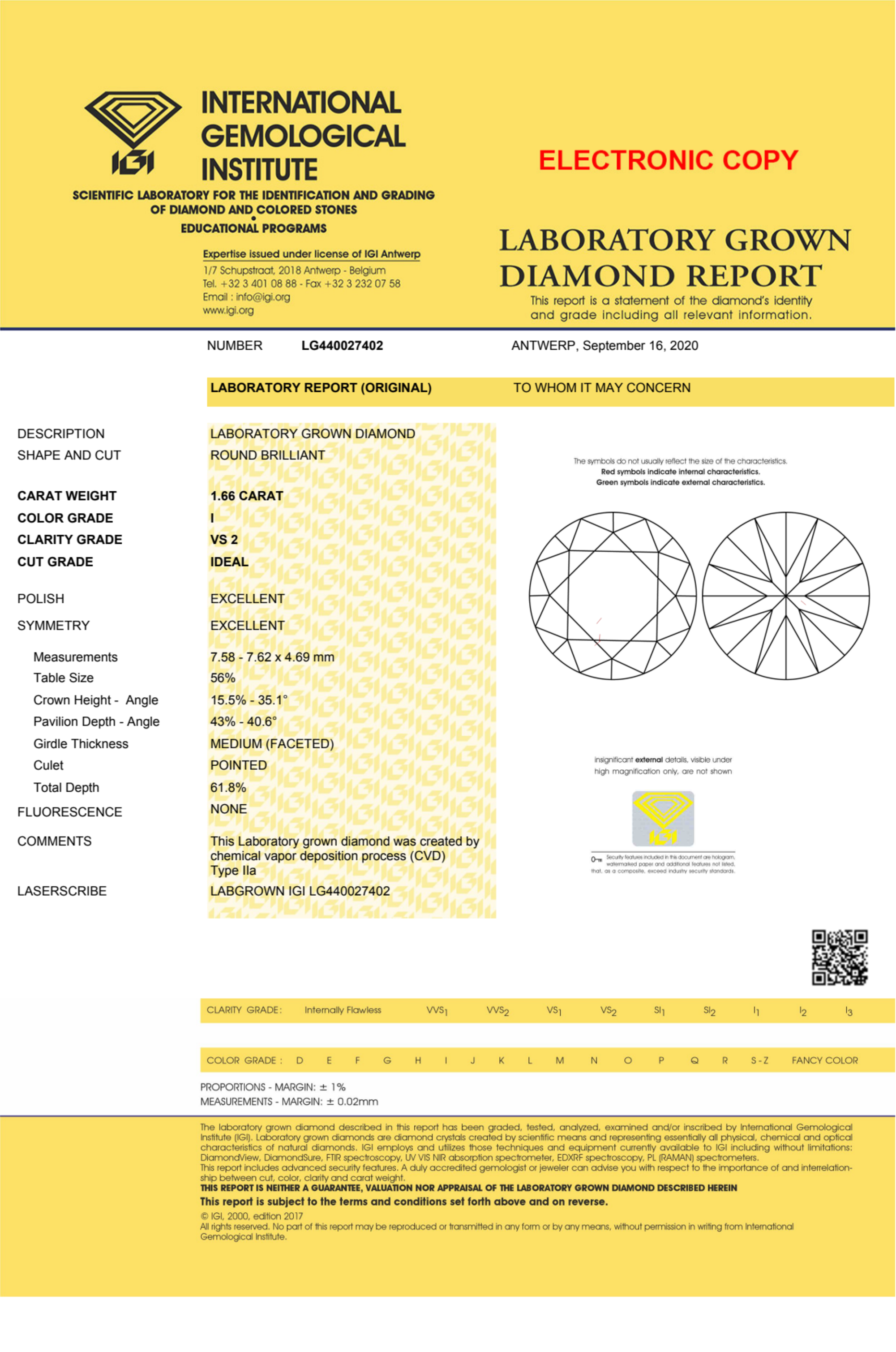 Your 1.66 carat Round lab diamond is graded I color (Near Colorless), and you can read more about I color diamonds here.